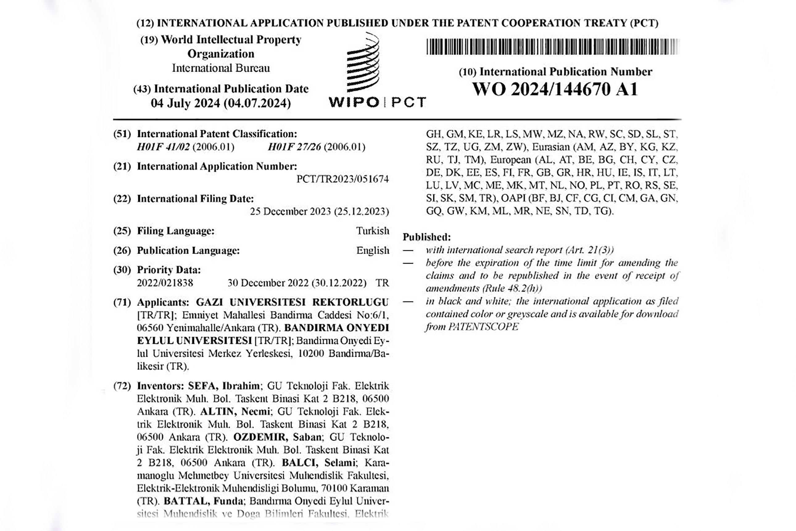 Mühendislik Fakültesi Elektrik-Elektronik Mühendisliği Bölümü Öğretim Üyesi ve Proje ve Teknoloji Transfer Ofisi (PTTO) Koordinatörü Doç. Dr. Selami Balcı’nın da içinde yer aldığı bilimsel çalışma World Intellectual Property Organization (WIPO) tarafından tescil edildi.
