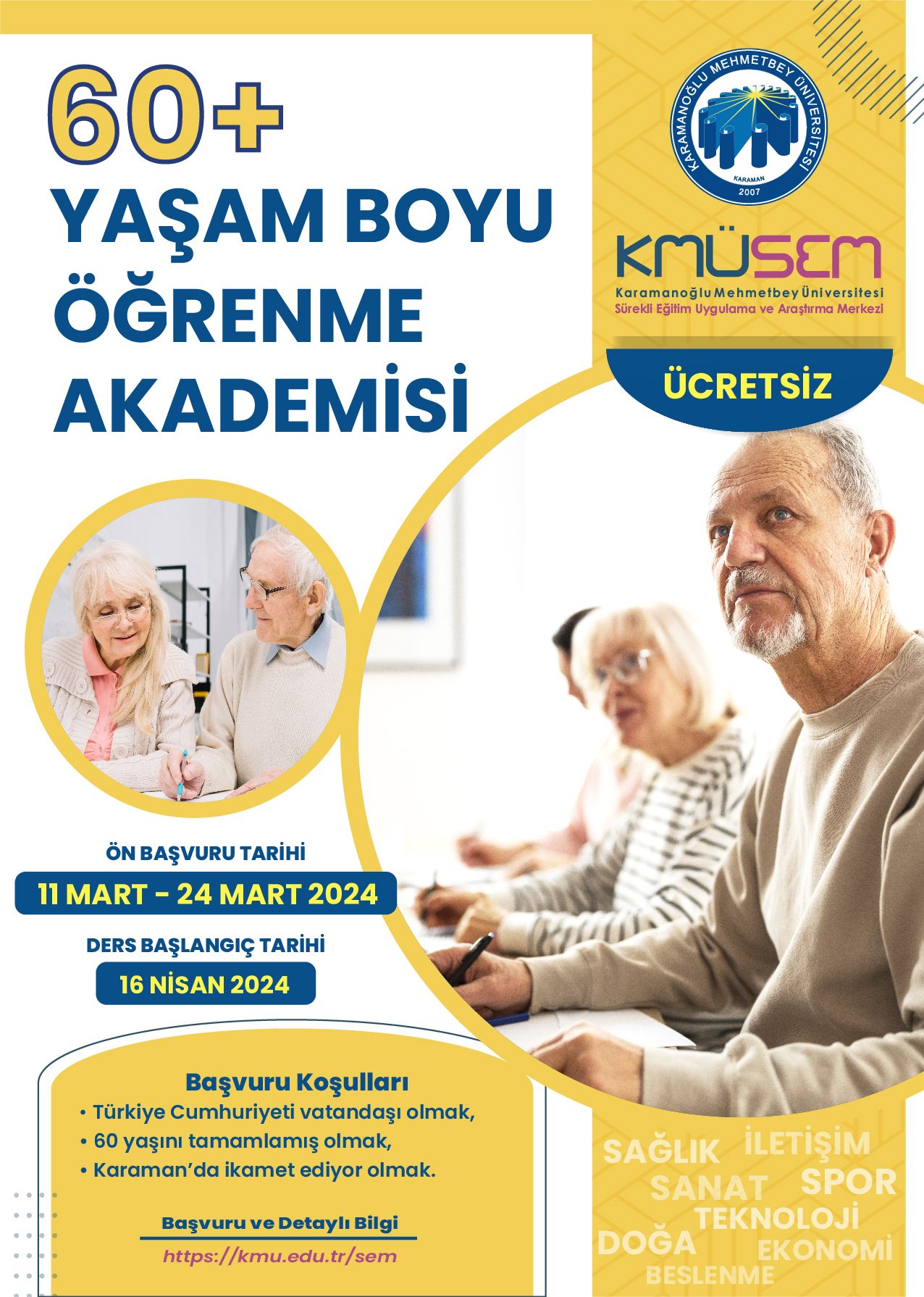 KMÜ Sürekli Eğitim Uygulama ve Araştırma Merkezi tarafından 60 yaş üzerindeki bireylerin bilgi, beceri ve yeteneklerinin korunması ve yenilerinin kazanılmasına destek olunması amacıyla düzenlenecek olan ‘60+ Yaşam Boyu Öğrenme Akademisi’ projesine başvurular başlıyor.Kuşaklararası bir etkileşim sağlanması ve 60 yaş üstü katılımcıların bilgi ve tecrübelerinden yararlanılması amacıyla gerçekleştirilecek olan program kapsamında sağlık, ekonomi, beslenme, iletişim, teknoloji, doğa, sanat ve spor gibi farklı alanlarda hem teorik hem de uygulamalı eğitimler verilmesi planlanıyor.Karaman’da ikamet eden 60 yaş üzeri tüm vatandaşların başvuru yapabileceği ücretsiz eğitim başvuruları 11 Mart 2024 Pazartesi günü başlıyor.KMÜ Yerleşkesinde verilecek eğitimlerle ilgili detaylı bilgiye https://kmu.edu.tr/sem adresinden ulaşılabilir.