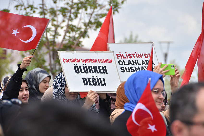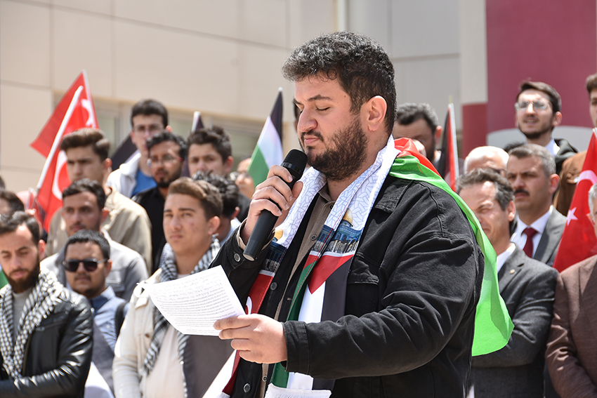 Öğrencilerin sloganlarla ve dövizlerle İsrail’in katliamlarına tepki gösterdiği yürüyüşün ardından basın açıklaması gerçekleştirildi.