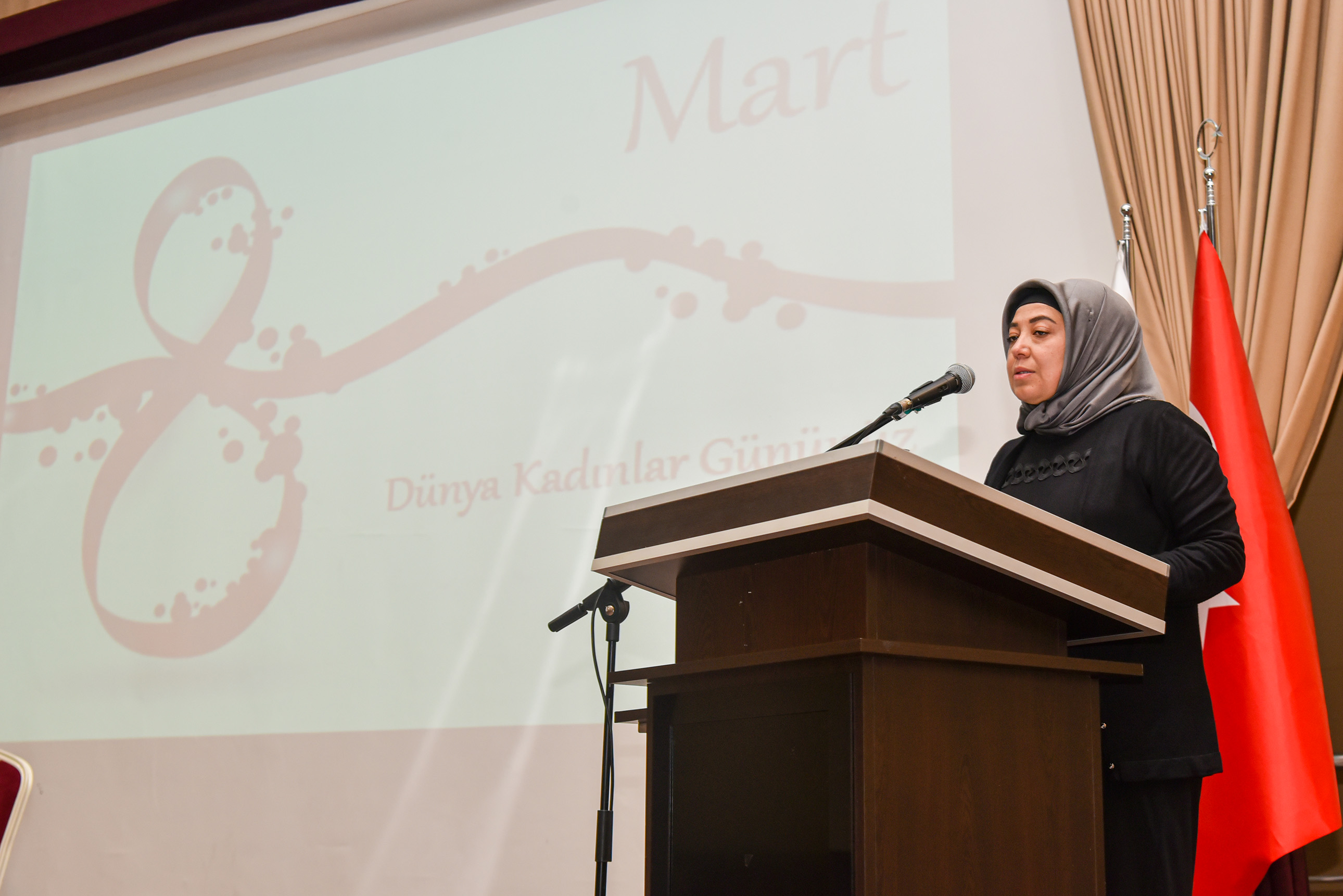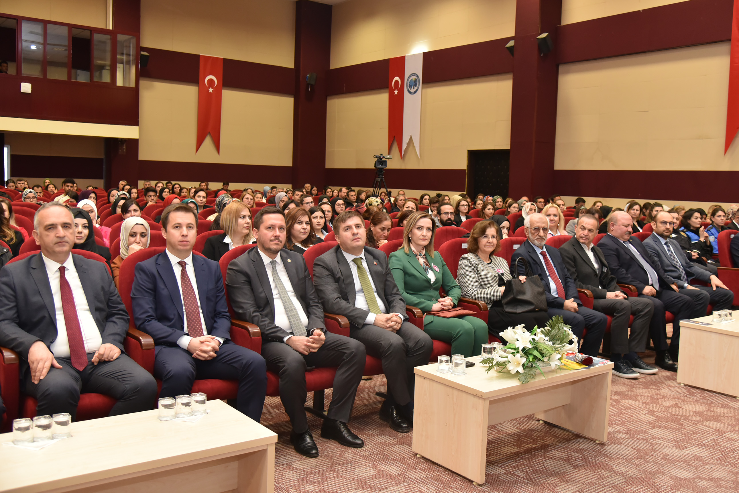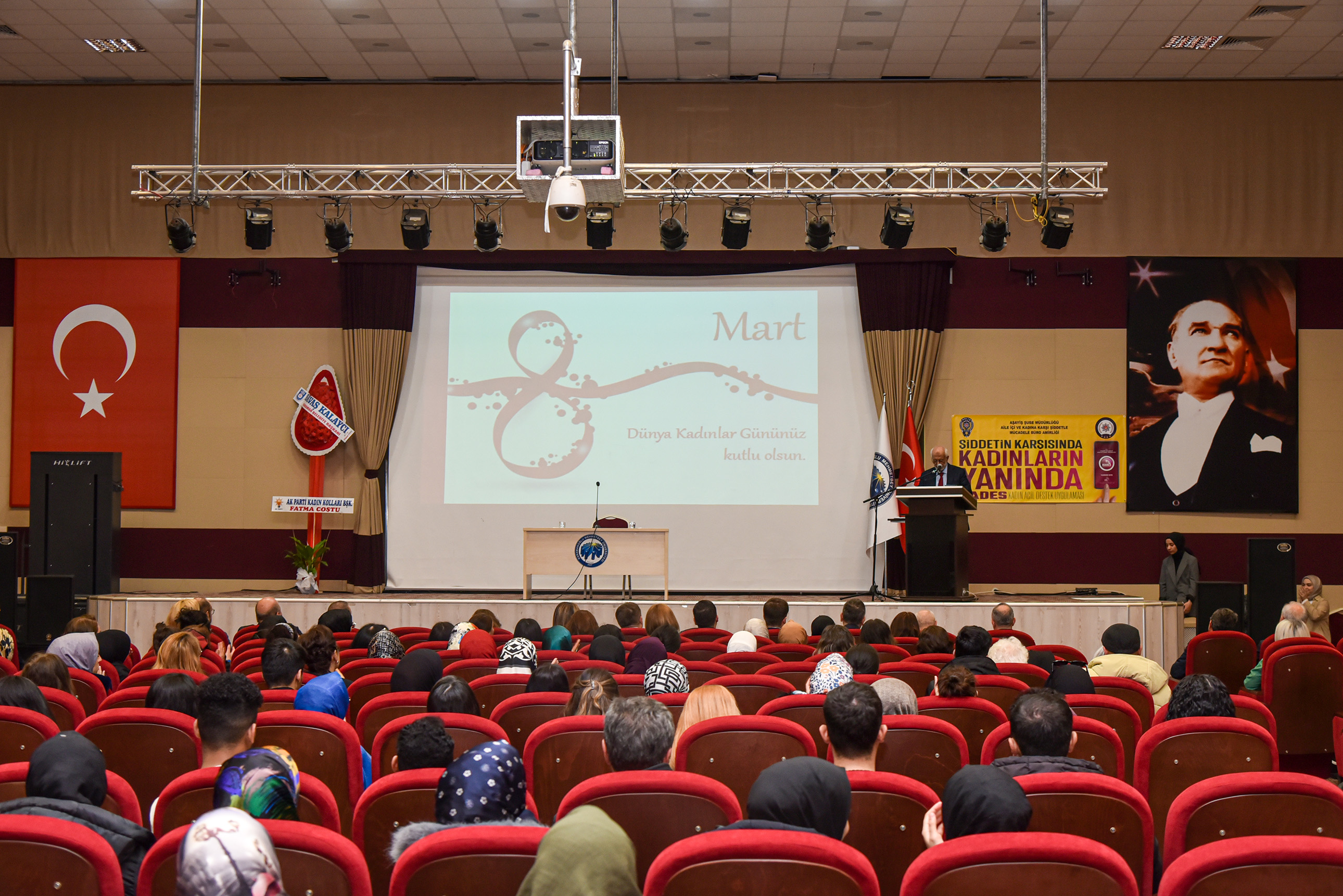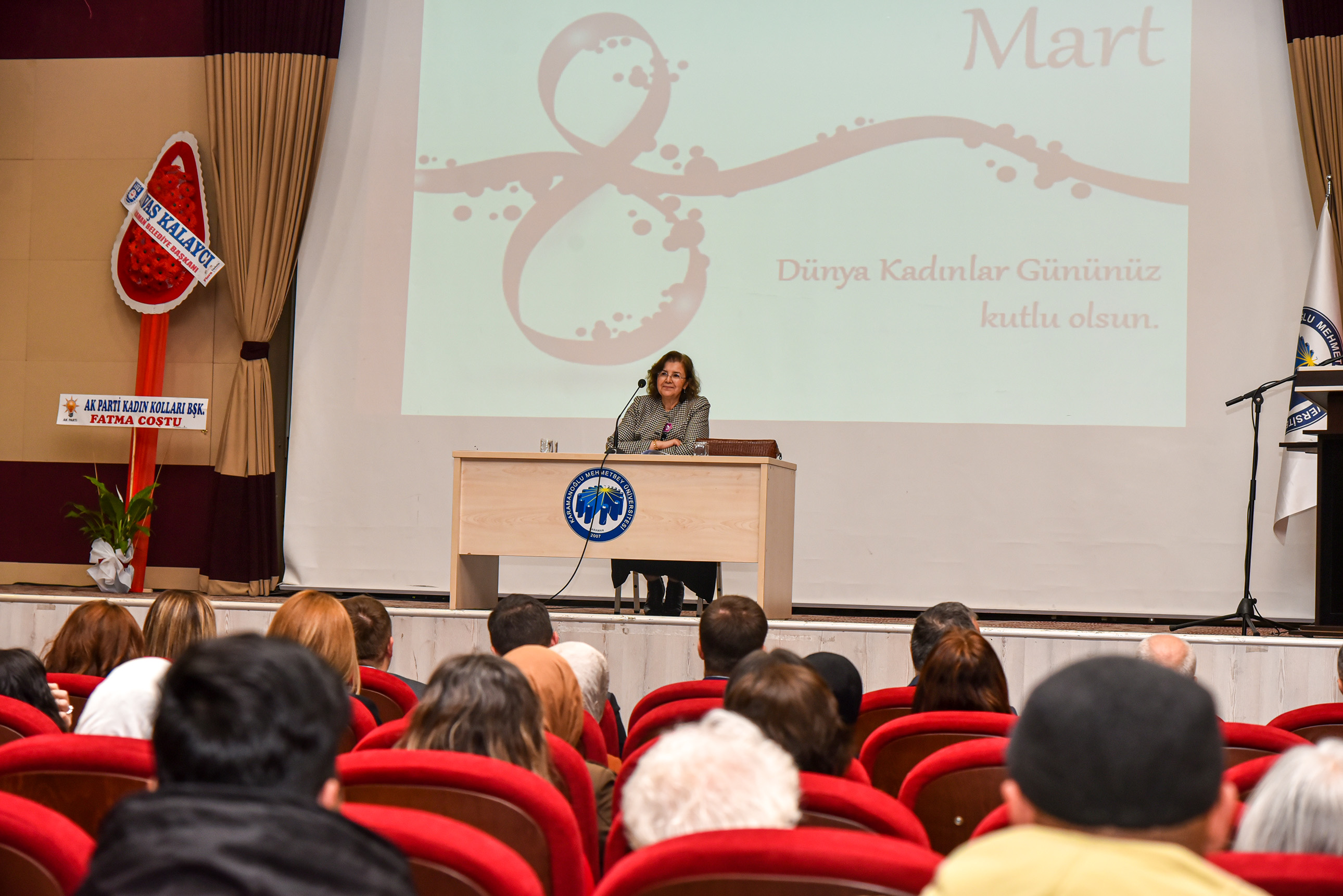 8 Mart Dünya Kadınlar Günü dolayısıyla düzenlenen konferansa Vali Hüseyin Engin Sarıibrahim ve eşi Hatice Sarıibrahim, Karaman Milletvekili Av. Selman Oğuzhan Eser, Cumhuriyet Başsavcısı Ali İhsan Akdoğan, KMÜ Rektör V. Prof. Dr. Mahmut Baykan, il ve üniversite protokolü, davetliler ve öğrenciler katıldı.Saygı duruşunda bulunulması ve İstiklal Marşı’nın okunmasıyla başlayan konferansta konuşan Kadın ve Aile Araştırmaları Uygulama ve Araştırma Merkezi Müdürü Dr. Öğretim Üyesi Hasibe Ceyhan, Türkiye’de ve Karaman özelinde çalışma hayatında kadın istihdamı verilerini paylaşarak şunları söyledi: “Dünyada ve Türkiye’de sosyal hayata, demokrasiye, ekonomiye, siyasete ve STK’lara kadınlarımızın ne kadar katkı verdiği ortadadır. Bu kadar emek varken Türkiye genelinde kurumlar arasında kadın istihdamı yeterli oranda değil. Ayrıca kadınlarımız karar mekanizmalarında ise oldukça az sayıda bulunmaktadır. Cennetin ayakları altında olduğu kadınlarımızın için her türlü fiziksel ve ruhsal şiddetten bir an önce kurtulmaları için hep birlikte mücadele etmeliyiz.“Rektör V. Prof. Dr. Mahmut Baykan ise “Ülkemizin gelişmesinde büyük bir katkıya sahip olan kadınlarımız toplumsal hayatımızın temel yapı taşını oluşturmaktadır. Kadınlarımız; emekleri ve çabalarıyla toplumumuzu güçlendiren, varlıklarıyla dünyamıza değer katan, sevginin, merhametin ve iyiliğin kaynağıdır. Tarihimiz boyunca ülkemizi en ileri seviyeye taşıyan, her alanda mücadele veren kadınlarımızı yürekten kutluyorum.” dedi.Konuşmaların ardından Ankara Bölge Adliye Mahkemesi (BAM) 1.Hukuk Dairesi Başkanı Zehra Öksüzoğlu’nun verdiği konferansa geçildi.Öksüzoğlu, 8 Mart Dünya Kadınlar Gününün tarihsel süreci, yargıda kadın olmak, kadın hakları konusunda Türk hukuku mevzuat kaynaklarından bahsetti.Ökszüoğlu, “Kadın ve erkek haklardan yararlanma konusunda eşittir ve öyle değerlendirmek gerekir. Kadın ve erkek birbirinin önünde veya arkasında değil yan yana olmalıdır. Sağlıklı toplumlar, sağlıklı ailelerden oluşur. Adalet Bakanlığımız kadın hakları konusunda çalışmalarına devam ediyor. Türkiye’de ve dünyada kadınların yüzde 39’u şiddete uğruyor. Şiddetin tekrarını önlemek çok önemlidir. Şiddeti sıfıra indirmek mümkün değil ama azaltmak için gerekli tedbirleri almak zorundayız. Adliyelere gelmeden bu işi halletmeliyiz. Hep birlikte çalışıp, gayret edip ülkemizi insanımızı daha iyi hale getirmeliyiz. Bunun için de herkes evinin önünü süpürmelidir.” şeklinde konuştu.Program, hediye ve belge takdimlerinin ardından sona erdi.