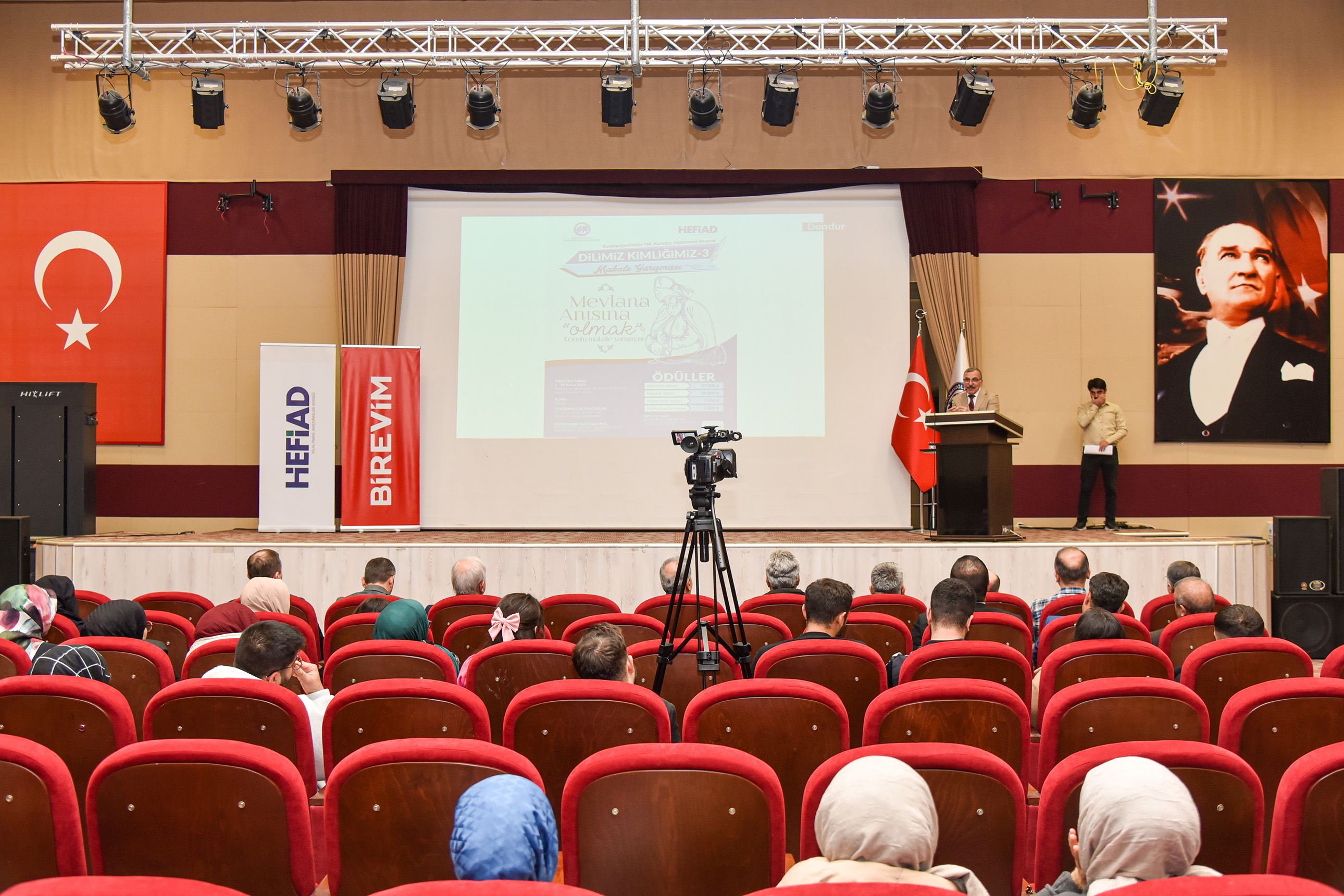 Cumhuriyetin 100. yılı anısına düzenlenen ‘Olmak’ konulu makale yarışması ödül törenine Rektör Prof. Dr. Mehmet Gavgalı, HEFİAD Genel Başkanı Mehmet Gürdaş, üniversite personeli ve öğrenciler katıldı.Ön lisans, lisans ve yüksek lisans öğrencilerinin katıldığı yarışmada seçici kurul adına söz alan KMÜ Edebiyat Fakültesi Türk Dili ve Edebiyatı Bölüm Başkanı Prof. Dr. İdris Nebi Uysal, “Mevlana, Yunus Emre ve Ömer Seyfettin adına ülkemizde pek çok yarışma düzenleniyor. Bizde KMÜ olarak ‘Dilimiz Kimliğimiz’ makale yarışmasının bu yıl üçüncüsünü gerçekleştirdik. Maksadımız burada sadece anmak değil, Mehmet Akif Ersoy, Necip Fazıl Kısakürek, Sezai Karakoç gibi hangi yazarı okuyorsak hayatımıza onun hayatından birçok noktayı devşirebilmektir. Bu isimler bizim medeniyetimize yön veren isimlerdir.” dedi.HEFİAD Genel Başkanı Mehmet Gürdaş ise “Dil, milletin en asli unsurudur. Dil bozulursa kültür bozulur. Kültür bozulursa adalet bozulur. Adalet bozulursa da kaos oluşur. ‘Dilimiz Kimliğimiz’ ana başlığı altında düzenlenen bu yarışmamızın Karaman’a ve memleketimize hayırlı olmasını diliyorum.” ifadelerini kullandı.Rektör Prof. Dr. Mehmet Gavgalı da “Üniversitemiz bünyesinde gerçekleştirilen yarışmada desteklerini esirgemeyen HEFİAD Genel Başkanı Mehmet Gürdaş’a, jürimize, yarışmaya katılan tüm öğrencilerimize ve emeği geçen herkese teşekkür ediyorum.” dedi.Programda açış konuşmalarının ardından dereceye giren öğrencilere ödülleri takdim edildi.