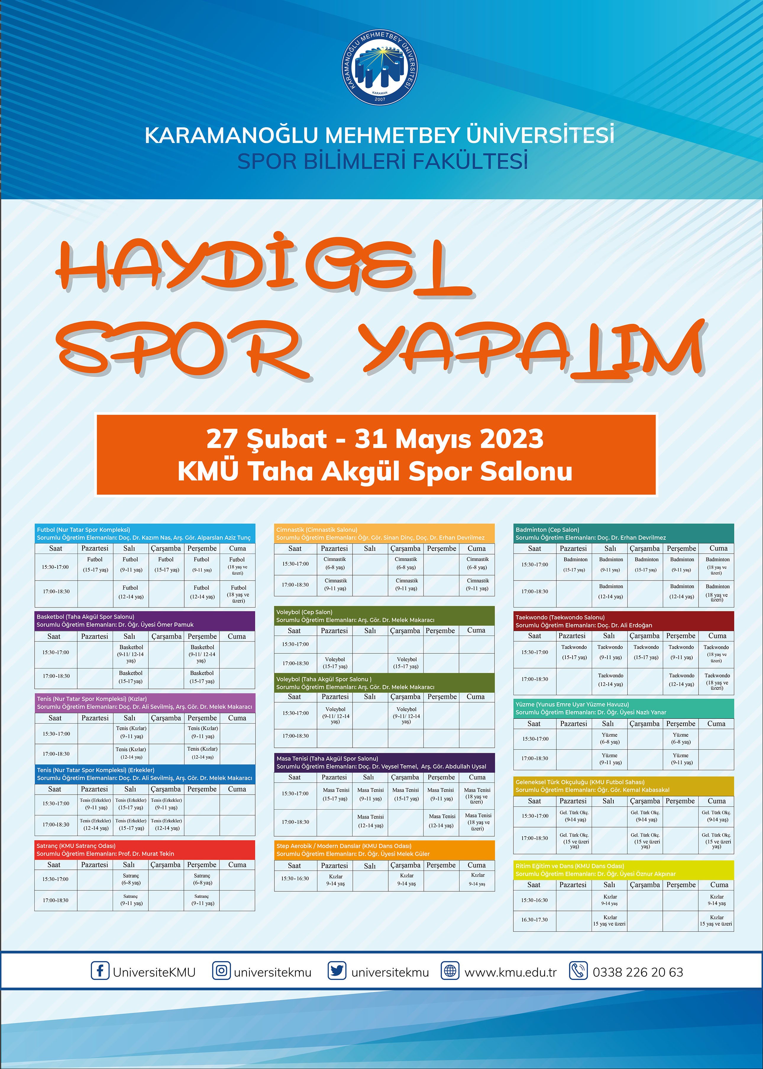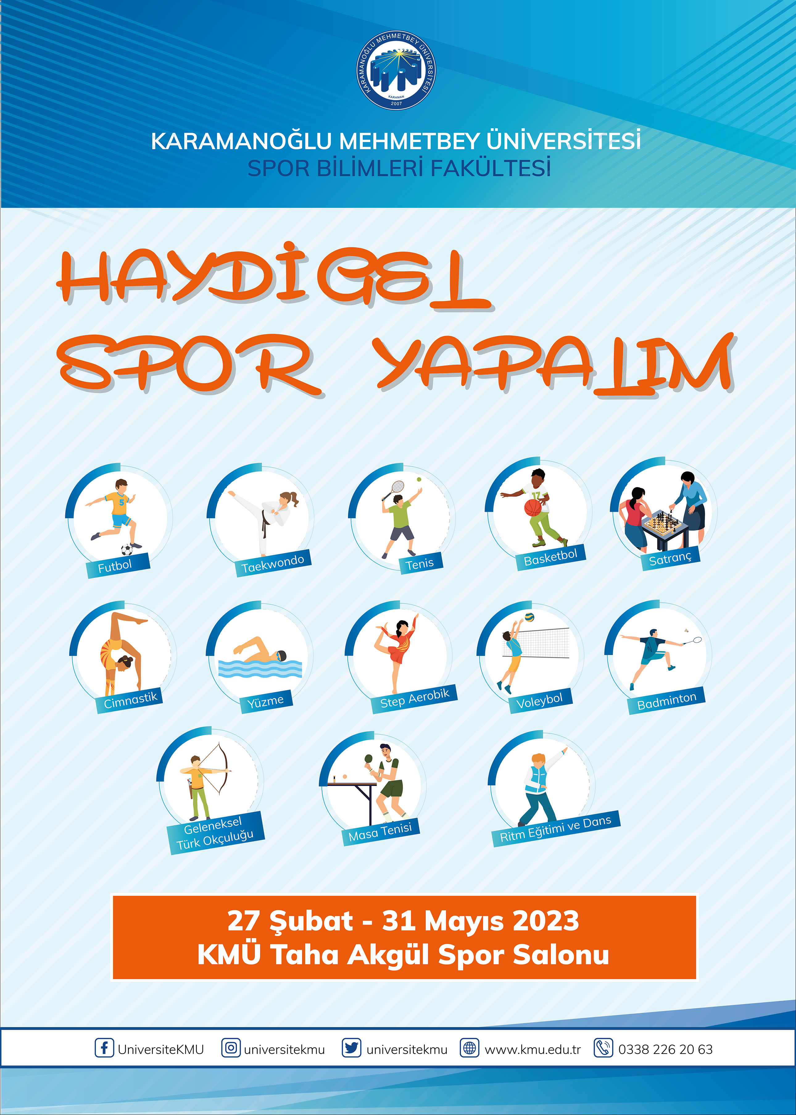 Spor Bilimleri Fakültesi depremden etkilenerek Karaman’a gelen vatandaşlara farklı branşlarda spor yapma imkanı sunacak. Fakülte futbol, taekwondo, tenis, cimnastik, ritm eğitimi, voleybol, badminton, geleneksel Türk okçuluğu gibi pek çok farklı alanda çocuk ve yetişkinlere kapılarını açacak. Taha Akgül Spor Salonunda 27 Şubat 2023 tarihinde başlayacak ‘Haydi Gel Spor Yapalım’ etkinliği 31 Mayıs 2023 tarihine kadar devam edecek.‘İlaç Toplama Kampanyası’