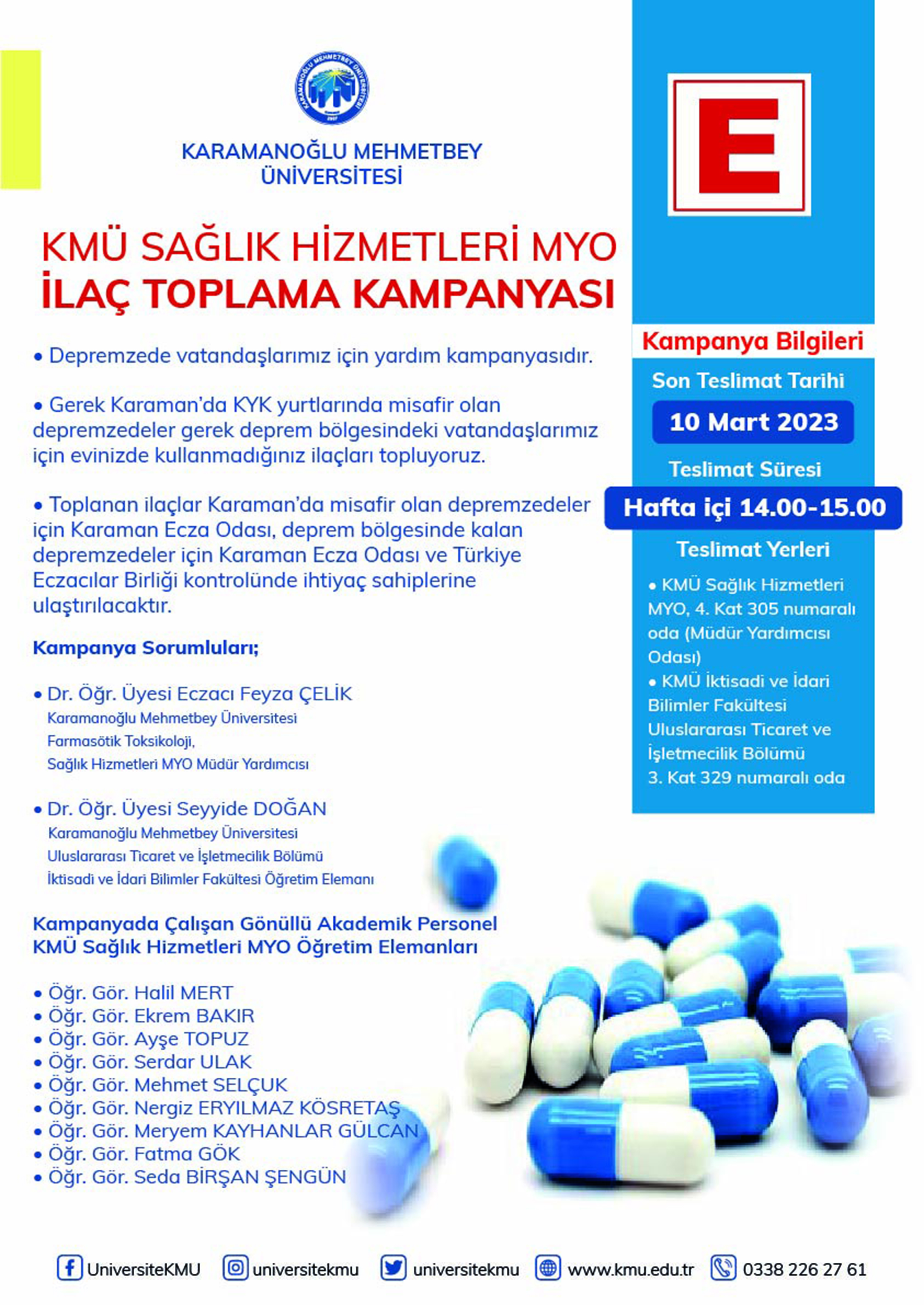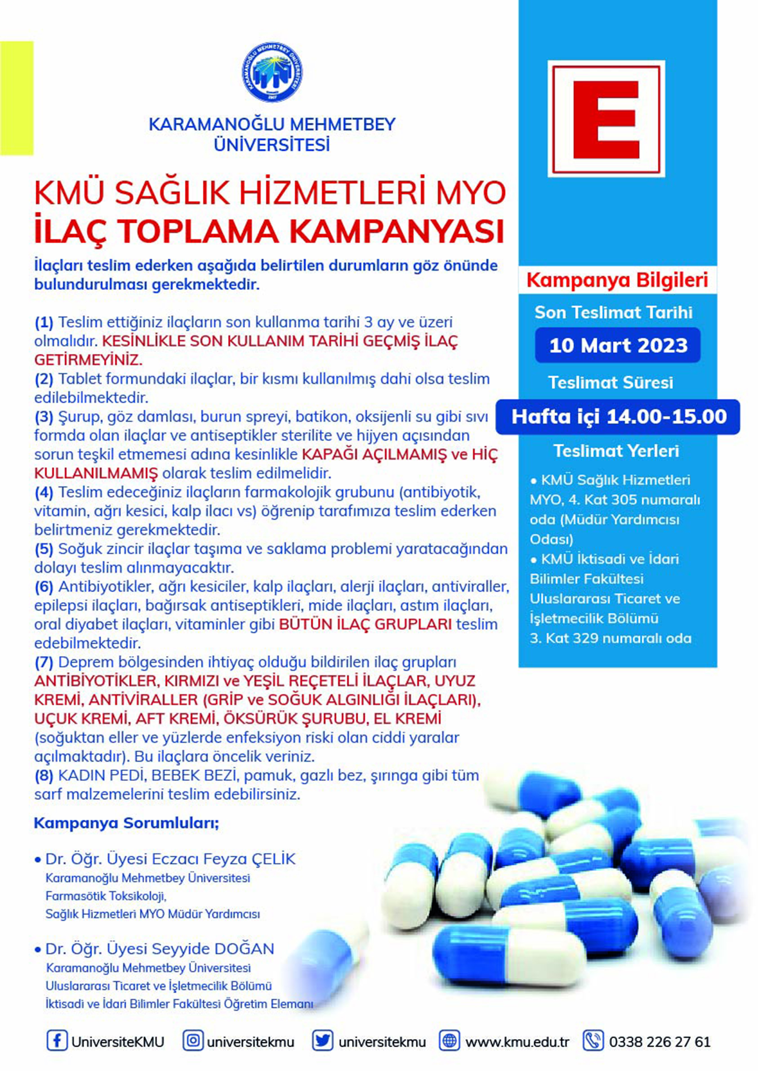 Sağlık Hizmetleri Meslek Yüksekokulunda ise ilaç toplama kampanyası başlatıldı. Kapağı açılmamış bütün ilaç gruplarının son kullanım tarihi 3 ay ve üzeri olanları kampanya ile toplanacak. Hafta içi her gün 14.00-15.00 saatleri arasında Sağlık Hizmetleri MYO ile İktisadi ve İdari Bilimler Fakültesine teslim edilebilecek ilaçlar, gerek Karaman’daki KYK yurtlarında kalan gerekse de afet bölgesinde yaşamlarını sürdüren depremzedelere Karaman Ecza Odası ve Türkiye Eczacılar Birliği kontrolünde ulaştırılacak. Kampanya 10 Mart 2023 tarihine kadar devam edecek.“Depremzede vatandaşlarımızı yalnız bırakmıyoruz”
