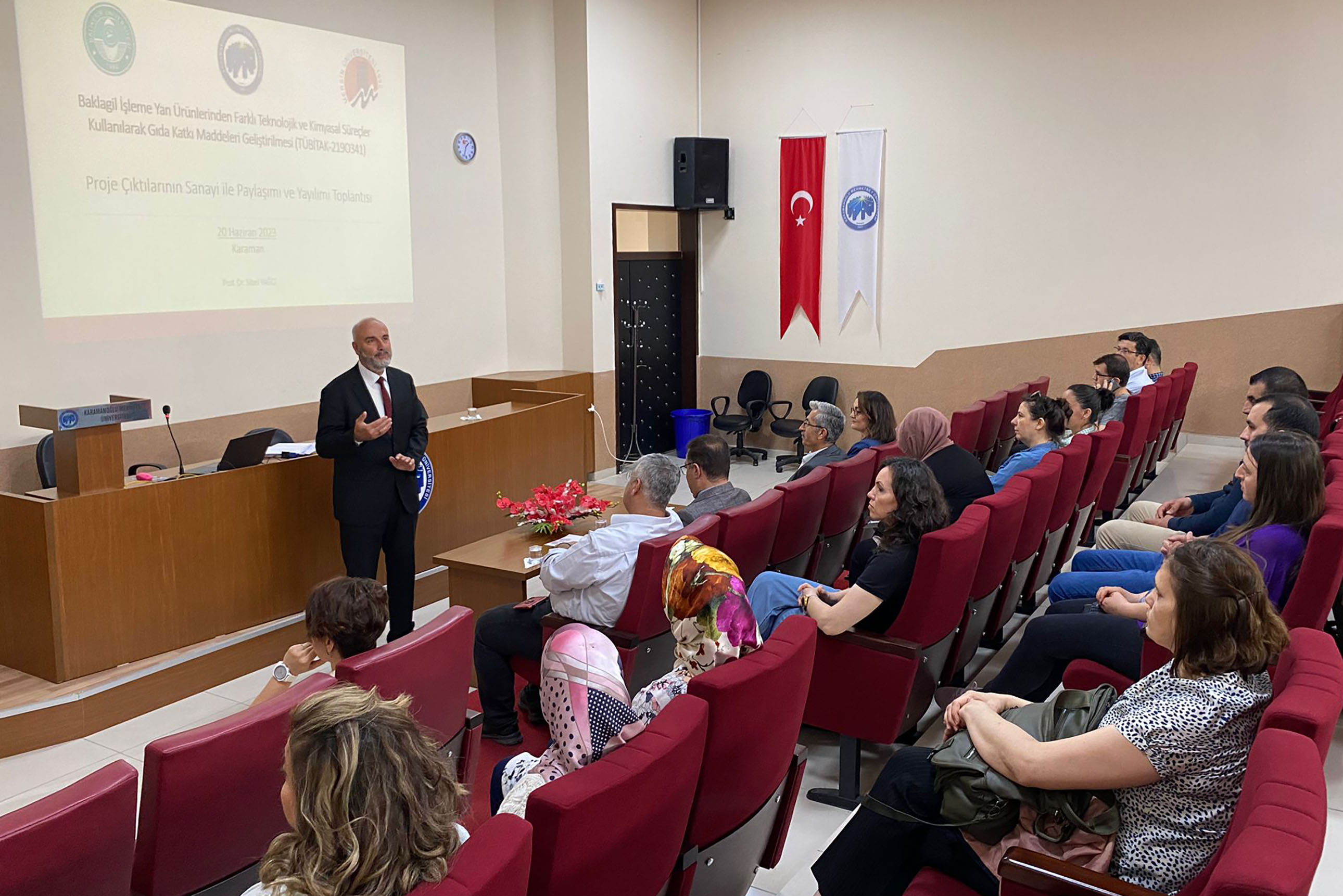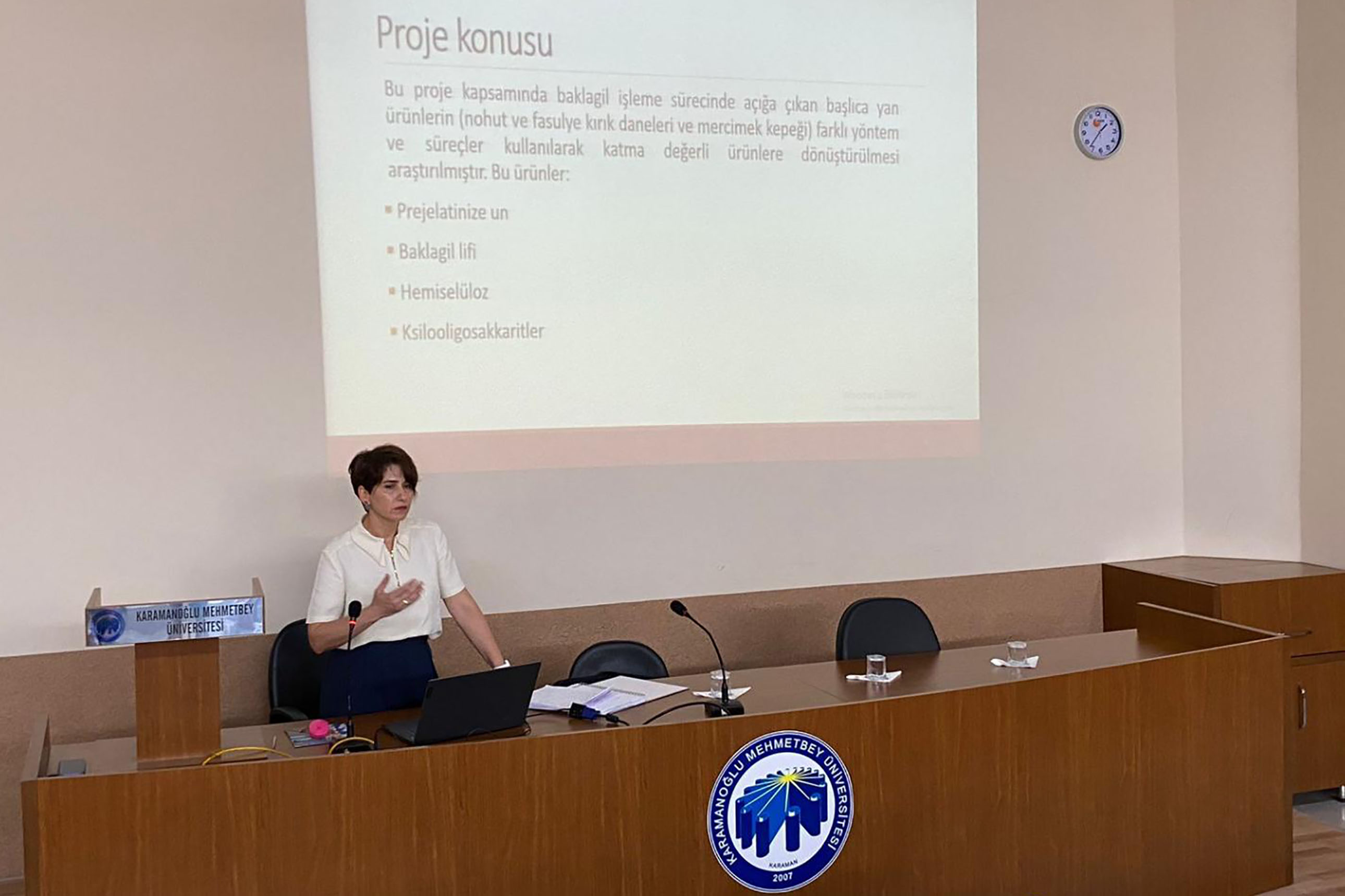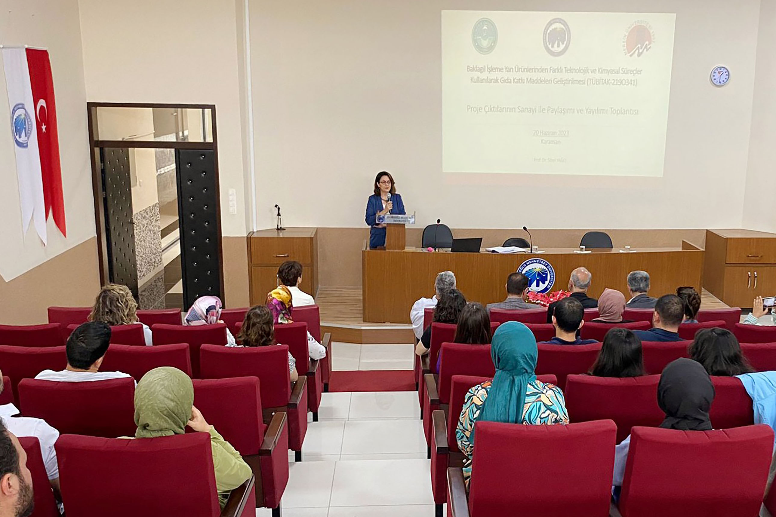 Karamanoğlu Mehmetbey Üniversitesi Mühendislik Fakültesi Gıda Mühendisliği, Balıkesir Üniversitesi ve Mersin Üniversitesi ortaklığında yürütülen ve TÜBİTAK 1001-Bilimsel ve Teknolojik Araştırma Projelerini Destekleme Programı kapsamında desteklenen araştırma projesinin kapanış toplantısı üniversitemiz ev sahipliğinde yapıldı.‘Baklagil İşleme Yan Ürünlerinden Farklı Teknolojik ve Kimyasal Süreçler Kullanılarak Gıda Katkı Maddeleri Geliştirilmesi’ başlıklı araştırma projesinin (TÜBİTAK-219O341) Proje Çıktılarının Sanayi ile Paylaşımı ve Yayılımı Toplantısı KMÜ Mühendislik Fakültesi Konferans Salonunda gerçekleştirildi. Toplantıya KMÜ Rektör V. Prof. Dr. Münir Oktay, Rektör Yardımcısı Prof. Dr. Nevzat Aydın, Mühendislik Fakültesi Dekanı Prof. Dr. Metin Sezer, sanayi temsilcileri, üniversitenin akademik personeli ve öğrenciler katıldı. Rektör V. Prof. Dr. Münir Oktay ve Gıda Mühendisliği Bölüm Başkanı Prof. Dr. Didem Sutay’ın açış konuşmaları ile başlayan toplantı, proje yürütücüsü Prof. Dr. Sibel Yağcı tarafından gerçekleştirilen sunum ile devam etti.Proje sunumunun ardından Gıda Mühendisliği Bölümü araştırma laboratuvarında proje ürünleri tanıtılarak ve ekstrüder teknolojisi ile örnek üretim uygulaması gerçekleştirildi.