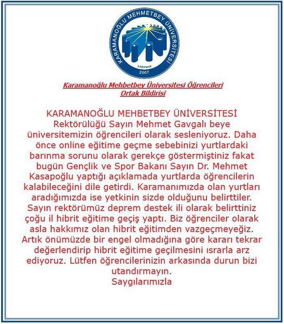 Karamanoğlu Mehmetbey Üniversitesi öğrencileri, ortak bildiri yayınlayarak Rektör Mehmet Gavgalı'ya seslendi. Öğrenciler, yüz yüze eğitim istediklerini bildirdiler.