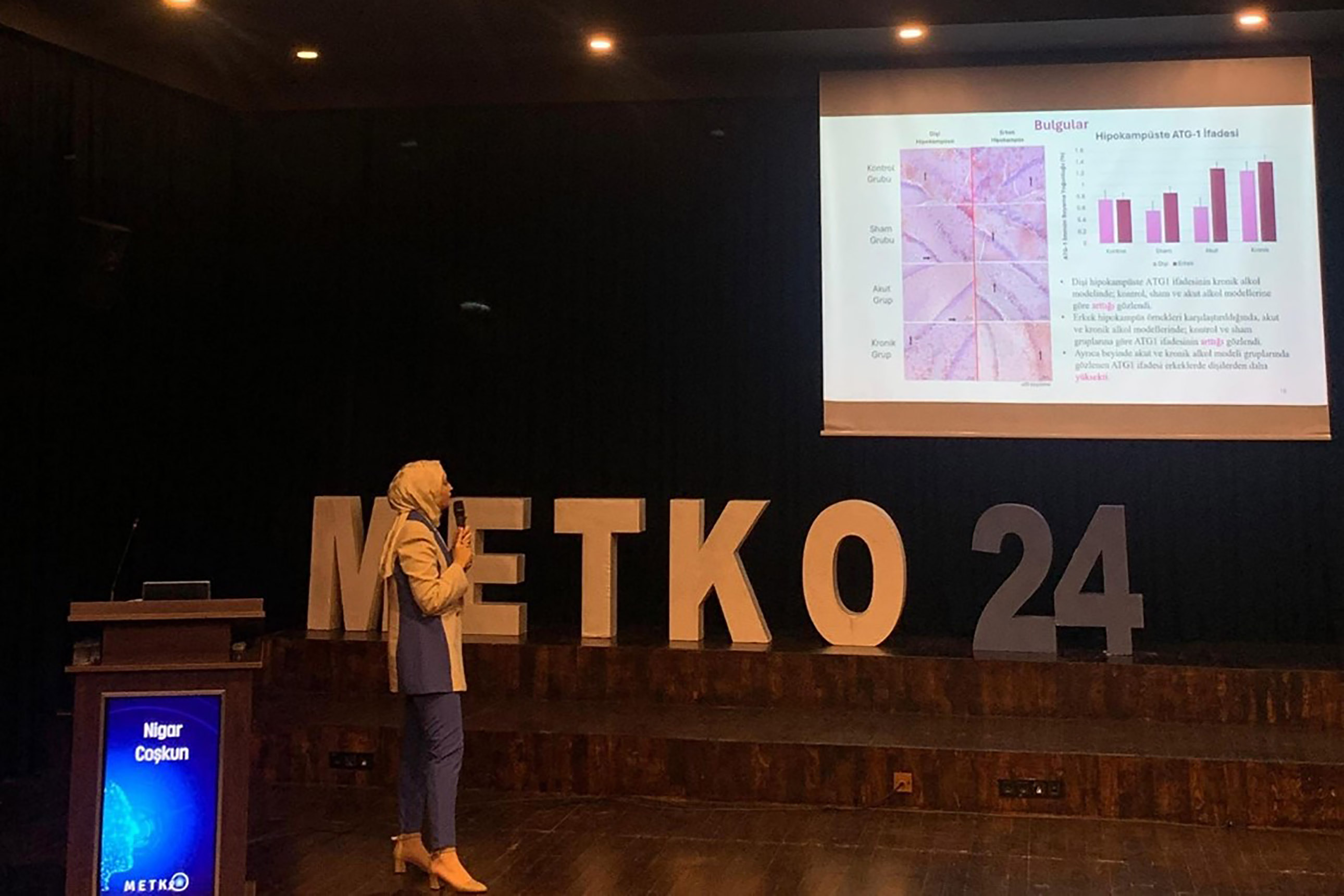 KMÜ öğrencisi Yaren Azra Şencan, ‘Ne Yiyorsan Osun: Multipl Skleroz ve Beslenme’ konusunda Nigâr Ebrar Coşkun ise TÜBİTAK 2209-A kapsamında desteklenen ‘Ratlardaki Alkol Bağımlılığının Hipokampüs Dokusundaki ATG-1 Proteininin İmmün Reaktivitesinin Cinsiyete Bağlı Değerlendirilmesi’ konulu araştırma hakkında bir sunum gerçekleştirdi.