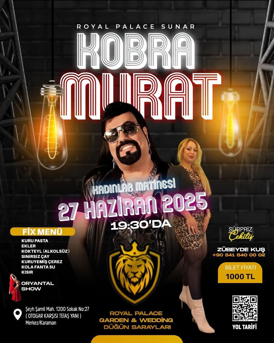 Karaman'ın eğlence hayatı, yaz aylarının gelişiyle birlikte adeta patlama noktasına geldi! Şehrin nabzını tutan etkinliklerin öncüsü Royal Palace Garden & Wedding Düğün Sarayları, 27 Haziran Perşembe akşamı, Türkiye'nin en renkli, en neşeli ve sahnedeki enerjisiyle her kesimi kendine hayran bırakan ismi Kobra Murat'ı ağırlayacak! Bu sadece bir matine değil, Karamanlı kadınların rüya gibi bir geceye uyanacağı, unutulmaz anılar biriktireceği gerçek bir şölen!Coşku, Müzik ve Sınırsız Eğlence Sözü!Kobra Murat, eşsiz sahne performansı, sevilen şarkıları ve enerjisiyle adeta bir kasırga gibi esecek! 27 Haziran Perşembe akşamı saat 19:30'da başlayacak bu muhteşem Kadınlar Matinesi, tüm stresinizi atacağınız, doyasıya dans edip eğleneceğiniz eşsiz bir fırsat sunuyor.Royal Palace'tan Zengin Menü ve Sürprizler!Gecenin tadını çıkarırken damaklarınızı şenlendirecek zengin bir "Fix Menü" sizleri bekliyor: birbirinden lezzetli kuru pastalar, taptaze eklerler, serinletici kolalar ve alkolsüz içecekler, demli çaylar, çıtır çıtır kuruyemiş çerezler ve vazgeçilmez kısır... Her detay, eğlenceye odaklanmanız için özenle düşünüldü!Oryantal Show ve Çekilişlerle Dolu Bir Gece!Eğlence sadece Kobra Murat'la sınırlı kalmayacak! Gecenin ilerleyen saatlerinde sahne alacak muhteşem Oryantal Show ile ritimler yükselecek, danslar havada uçuşacak. Ayrıca geceye özel sürpriz çekilişlerle şanslı misafirlerimiz birbirinden güzel hediyelerin sahibi olacak! Bu geceden eli boş ayrılmak neredeyse imkansız!Yerlerinizi Şimdiden Ayırtın!Bu muhteşem geceye katılmak için acele edin! Sınırlı sayıdaki yerler hızla tükeniyor. Detaylı bilgi ve rezervasyon için Zübeyde Kuş'u 0541 640 00 02 numaralı telefondan arayabilirsiniz.Karaman Royal Palace Garden Adresi:ROYAL PALACE GARDEN & WEDDING DÜĞÜN SARAYLARI Şeyh Şamil Mah. 1200 Sokak No:27 (OTOGAR KARŞISI VE TEİAŞ YANI) Merkez/Karaman27 Haziran Perşembe akşamı Kobra Murat ile Karaman'da müzik ve eğlence rüzgarı esecek! Bu muhteşem buluşmayı kaçırmayın, yerinizi şimdiden ayırtın ve eğlenceye doyun!