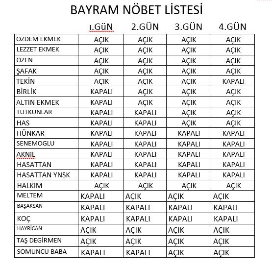 Kurban Bayramında vatandaşın ekmek sıkıntısı yaşamaması adına Karaman il merkezinde nöbet tutacak olan ekmek fırınları belirlendi. Karaman Esnaf ve Sanatkarlar Odaları Birliği, yaptığı duyurda, Kurban Bayramı'nda hizmet veren fırınları liste halinde yayınladı.İşte bayram süresince Karaman'da vatandaşlara hizmet verecek o fırın listesi: