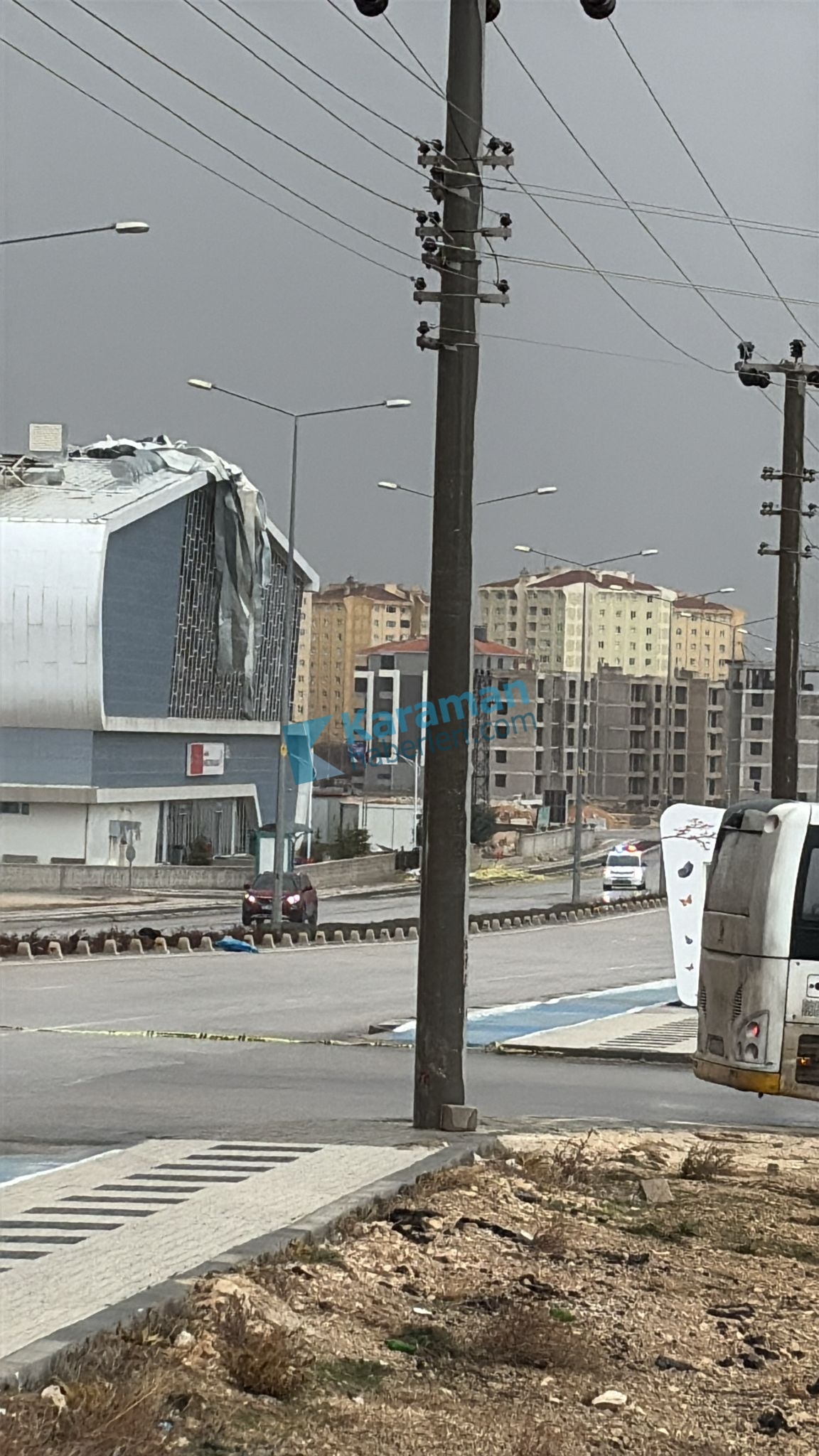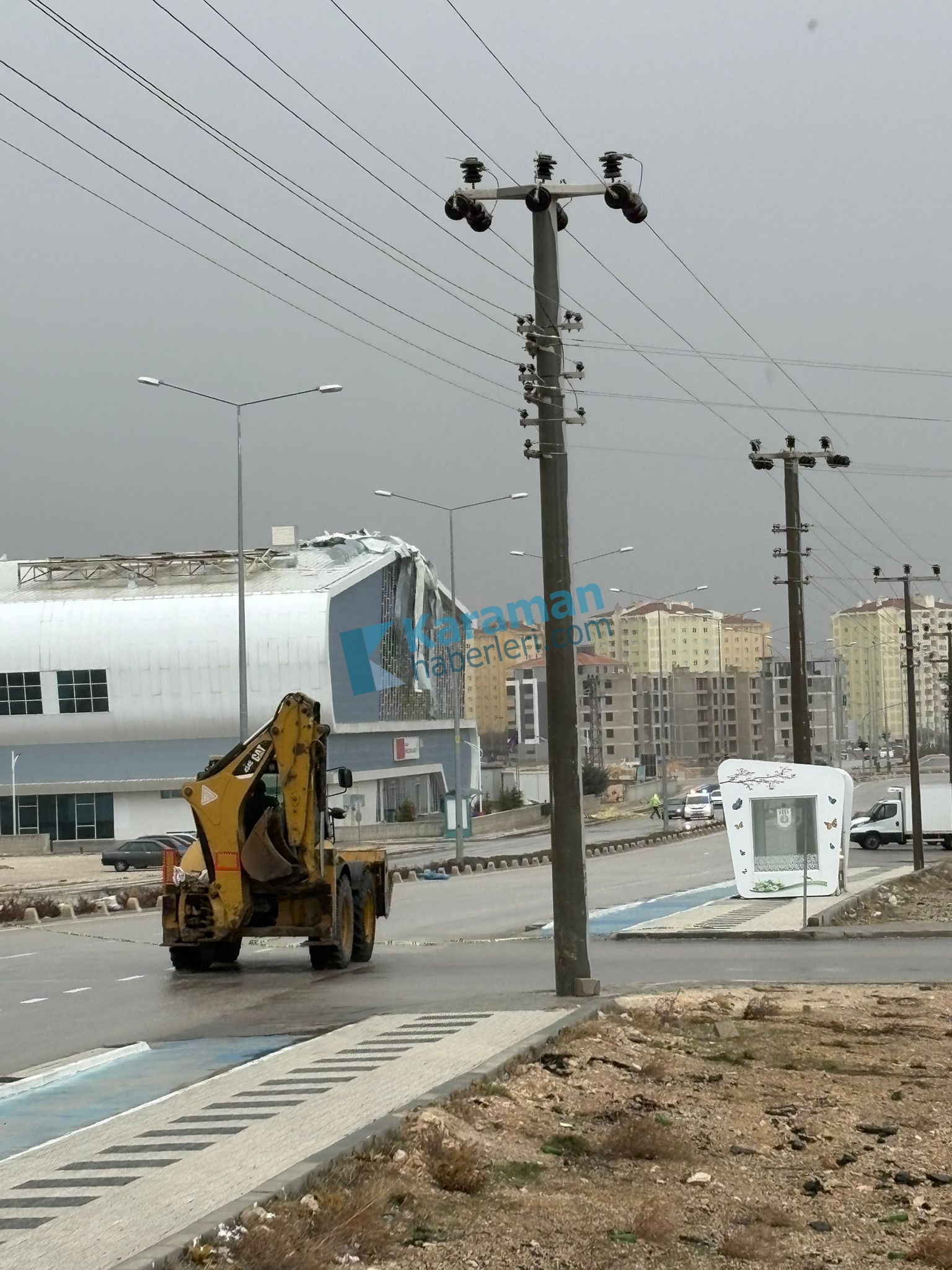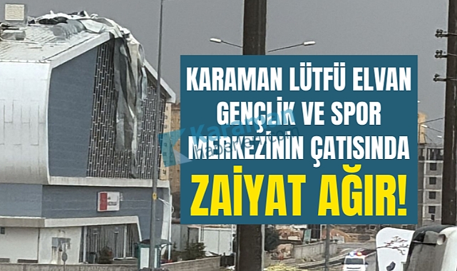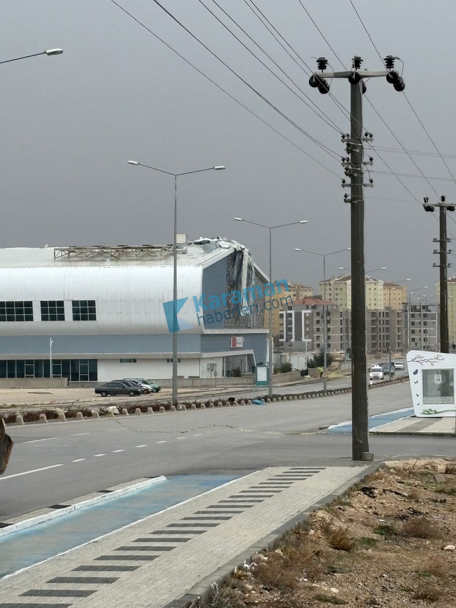 Saatlerce devam eden kuvvetli rüzgâr nedeniyle birçok noktada çatı uçmaları yaşanırken, Karaman’da bulunan Lütfü Elvan Gençlik ve Spor Merkezi’nin çatısı da büyük hasar gördü.