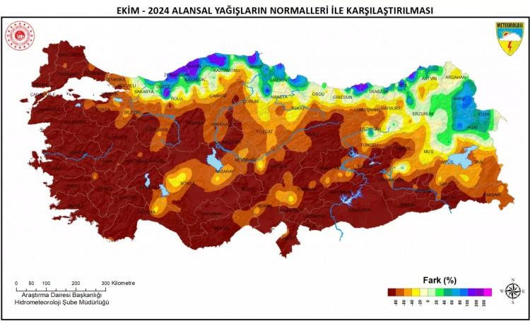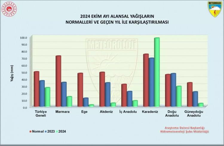 Raporda, Türkiye geneli ekim ayı yağışının, normalin ve geçen yıl ekim ayı yağışının altında gerçekleştiği belirtildi. Rapora göre, ekim ayı yağışı metrekareye ortalama 26,8 kilogram ölçülürken, ekim ayı normali (1991-2020) 49,4 kilogram, 2023 yılı ekim ayı yağışı 36,6 kilogram olarak açıklandı. Raporda, yağışlarda normaline göre yüzde 46, geçen yıl ekim ayı yağışına göre yüzde 27 azalma meydana geldiği belirtildi.