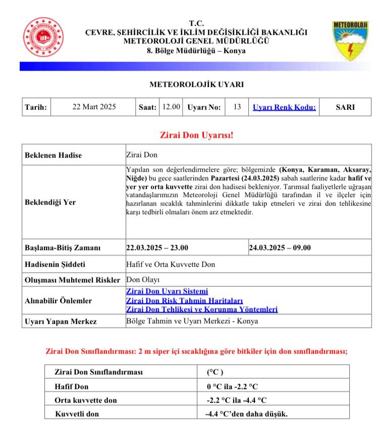 Meteorolojinin yaptığı son değerlendirmelerin ardından Karaman'ı da kapsayan bölgede hafif ve orta kuvvetle zirai don riskine karşı vatandaşlar uyarıldı.