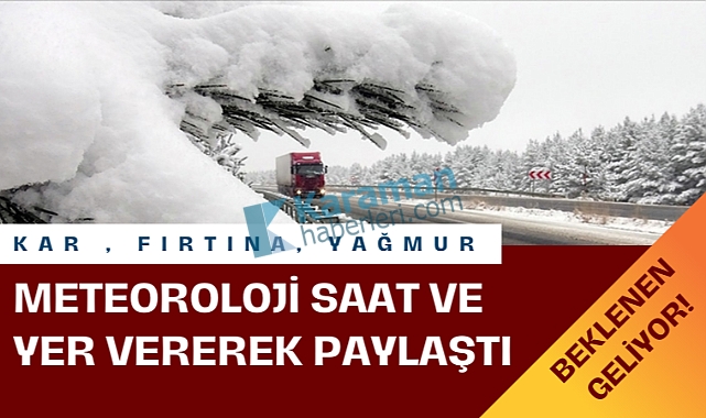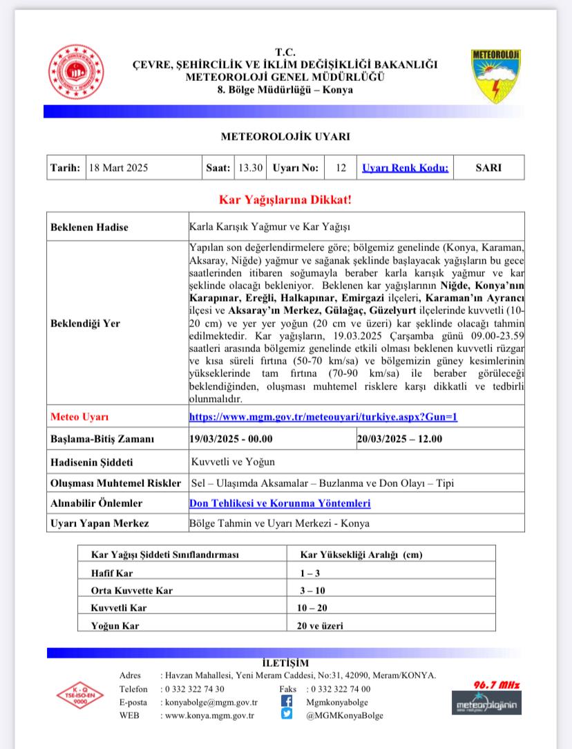 Meteoroloji 8. Bölge Müdürlüğü'nün yaptığı son değerlendirmelere göre, bölge genelinde başlaması beklenen sağanak yağmur yağışlarının, bu gece itibari ile soğuk hava etkisine girmesi ve karla karışık yağmur ve kar yağışı şeklinde devam etmesi beklentiler arasında.Yapılan değerlendirmeler sonrası, meteorolojinin açıklaması şu şekilde:"Bölgemiz genelinde (Konya, Karaman, Aksaray, Niğde) yağmur ve sağanak şeklinde başlayacak yağışların bu gece saatlerinden itibaren soğumayla beraber karla karışık yağmur ve kar şeklinde olacağı bekleniyor. Beklenen kar yağışlarının Karaman'ın Ayrancı ilçesi ve yüksek kesimleri, Niğde, Konya'nın Karapınar, Ereğli, Halkapınar ve Emirgazi ilçeleri, Aksaray'ın Merkez, Gülağaç ve Güzelyurt ilçelerinde kuvvetli (10-20 cm) ve yer yer yoğun kar şeklinde olacağı tahmin ediliyor.Kar yağışlar, 19 Mart Çarşamba günü 09:00 ile 23:59 saatleri arasında bölgemizde etkisini göstermesi beklenen kuvvetli rüzgar ve kısa süreli fırtına ile beraber görüleceği tahmin edildiği için oluşması muhtemel risklere karşı tedbirli olunmalıdır."