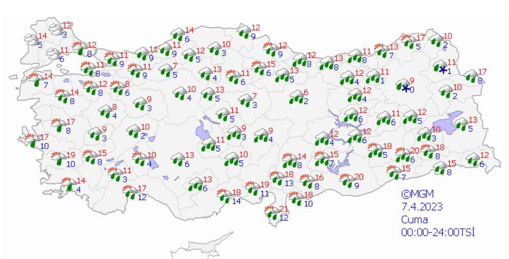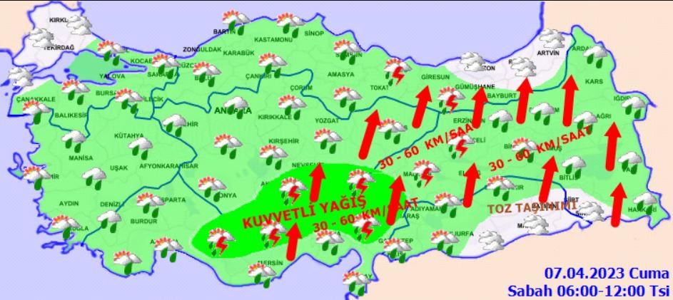 Ülkemiz genelinin parçalı ve çok bulutlu, Trakya kesimi dışında tüm bölgelerin yağışlı geçeceği tahmin ediliyor. Yağışların genellikle yağmur ve sağanak, yer yer gök gürültülü sağanak, Doğu Anadolu’nun kuzey ve doğusunun yükseklerinde karla karışık yağmur ve kar şeklinde olmak üzere; Doğu Anadolu’nun batısı, Kahramanmaraş, Karaman, Niğde, Kayseri, Sivas, Ordu, Giresun, Trabzon, Tokat, Gümüşhane, Bayburt, Erzurum, Ağrı, Muş, Bitlis, Adıyaman ve Diyarbakır çevreleri ile Adana ve Osmaniye’nin kuzey kesimlerinde yerel olarak kuvvetli olması bekleniyor. Güneydoğu Anadolu’da toz taşınımı görüleceği tahmin ediliyor. Doğu Karadeniz’in iç kesimleri ile Doğu Anadolu’nun eğimli ve yüksek kesimlerinde çığ tehlikesi riski bulunmaktadır.Hava sıcaklıklarının iç ve batı kesimlerde 2 ila 4 derece azalacağı, diğer yerlerde önemli bir değişiklik olmayacağı, genellikle mevsim normalleri civarında seyredeceği tahmin ediliyor.Rüzgarın güneyli yönlerden hafif ara sıra orta kuvvette, Doğu Akdeniz’in iç kesimleri, İç Anadolu'nun doğusu, Doğu Anadolu, Orta ve Doğu Karadeniz’in iç kesimleri ile Güneydoğu Anadolu’nun kuzeyinde güney ve güneybatı yönlerden kuvvetli olarak (40-60 km/saat) eseceği tahmin ediliyor.KUVVETLİ RÜZGAR UYARISI