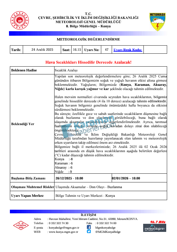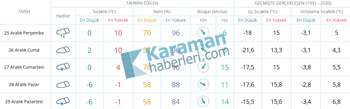 Meteoroloji verilerine göre Karaman, Konya, Aksaray ve Niğde genelinde yağışların yer yer karla karışık yağmur, yüksek kesimlerde ise kar şeklinde görülmesi tahmin ediliyor.