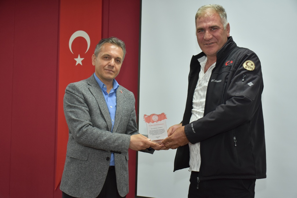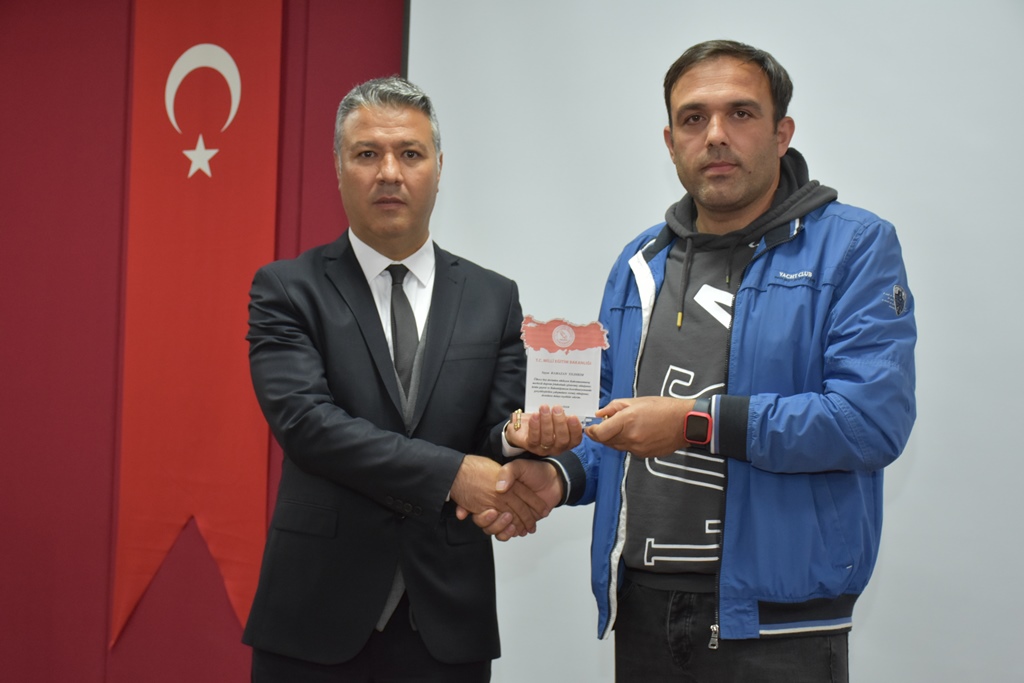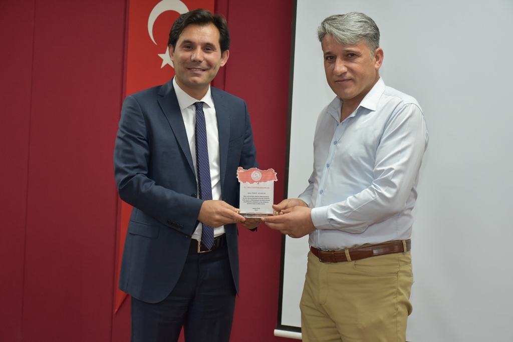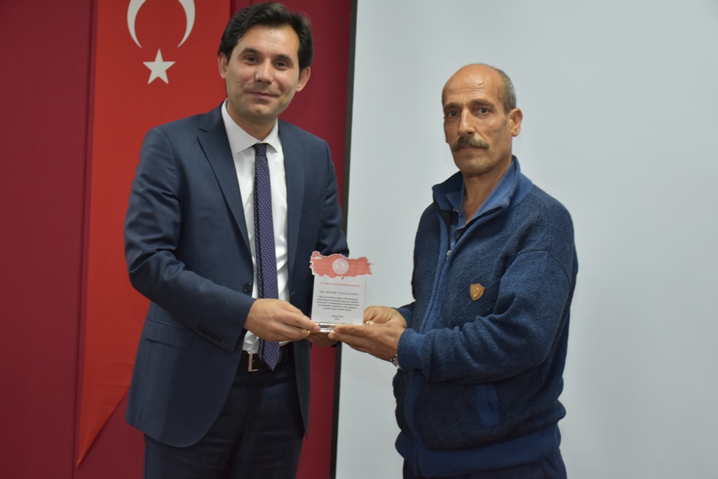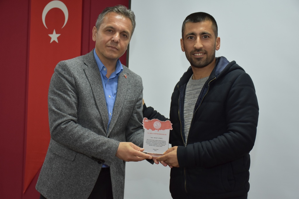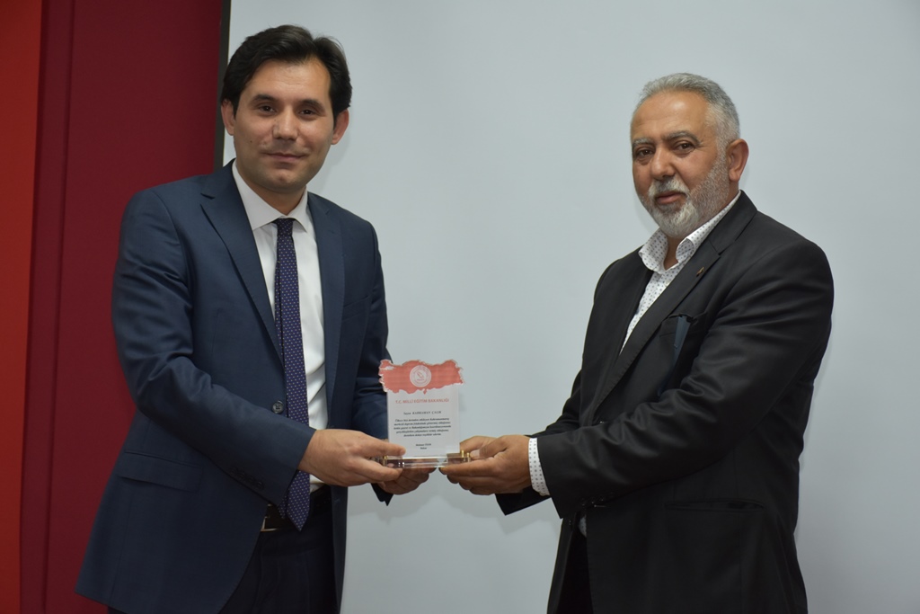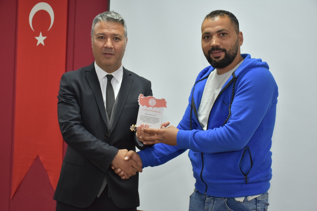 6 Şubat'ta meydana gelen deprem sonrasında bölgedeki arama-kurtarma ve destek faaliyetlerinde görev alan Karaman Millî Eğitim Müdürlüğü AKUB, ilk yardım ve destek hizmetleri çalışanlarına İl Milli Eğitim Müdürü Mehmet Çalışkan tarafından plaketleri verildi.
