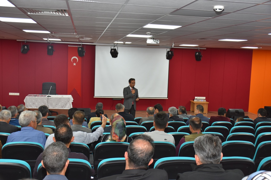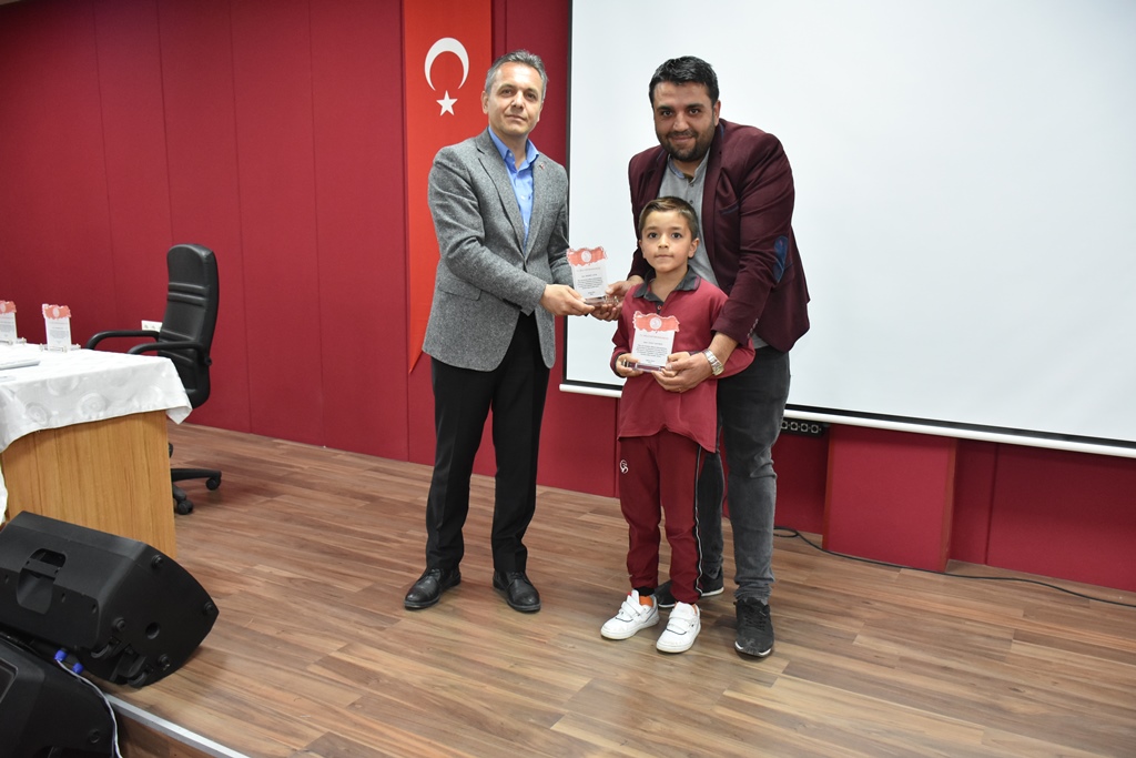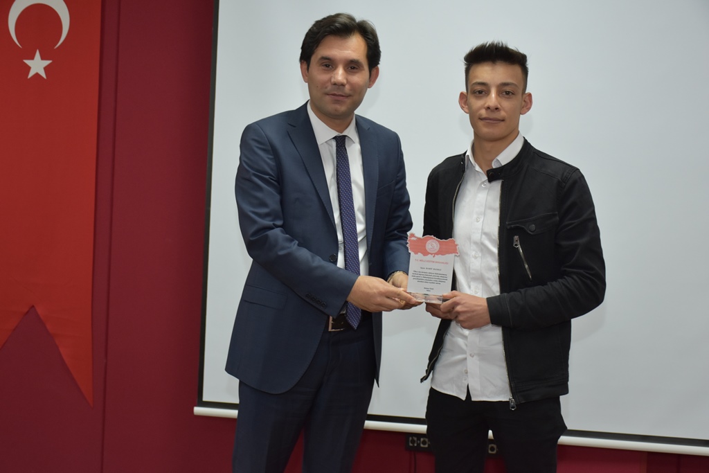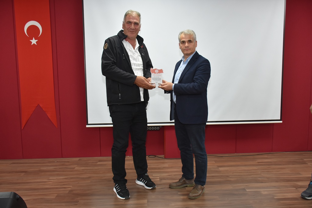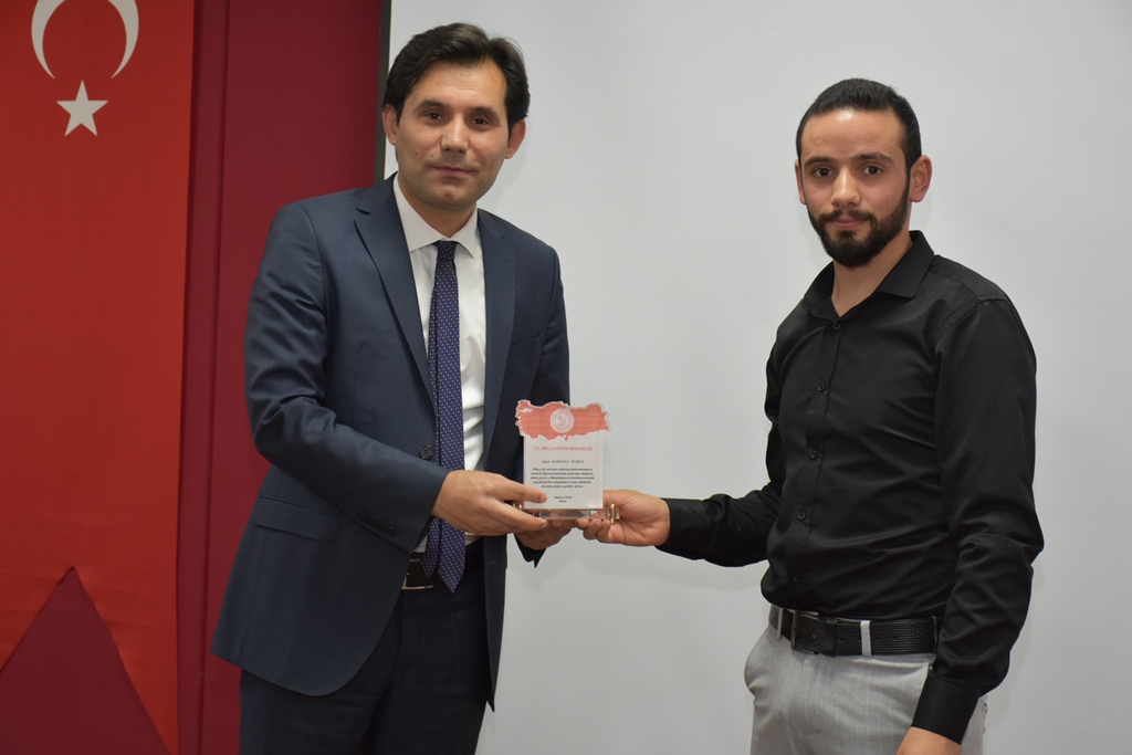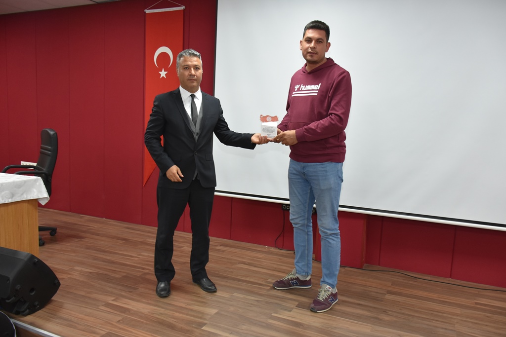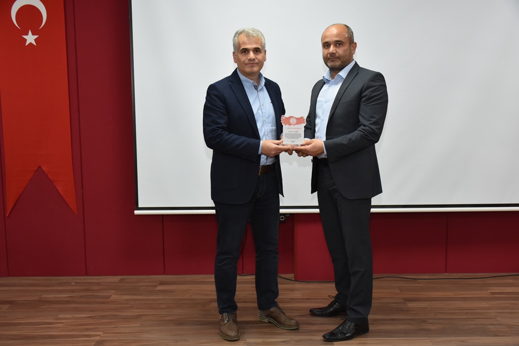 6 Şubat'ta meydana gelen deprem sonrasında bölgedeki arama-kurtarma ve destek faaliyetlerinde görev alan Karaman Millî Eğitim Müdürlüğü AKUB, ilk yardım ve destek hizmetleri çalışanlarına İl Milli Eğitim Müdürü Mehmet Çalışkan tarafından plaketleri verildi.