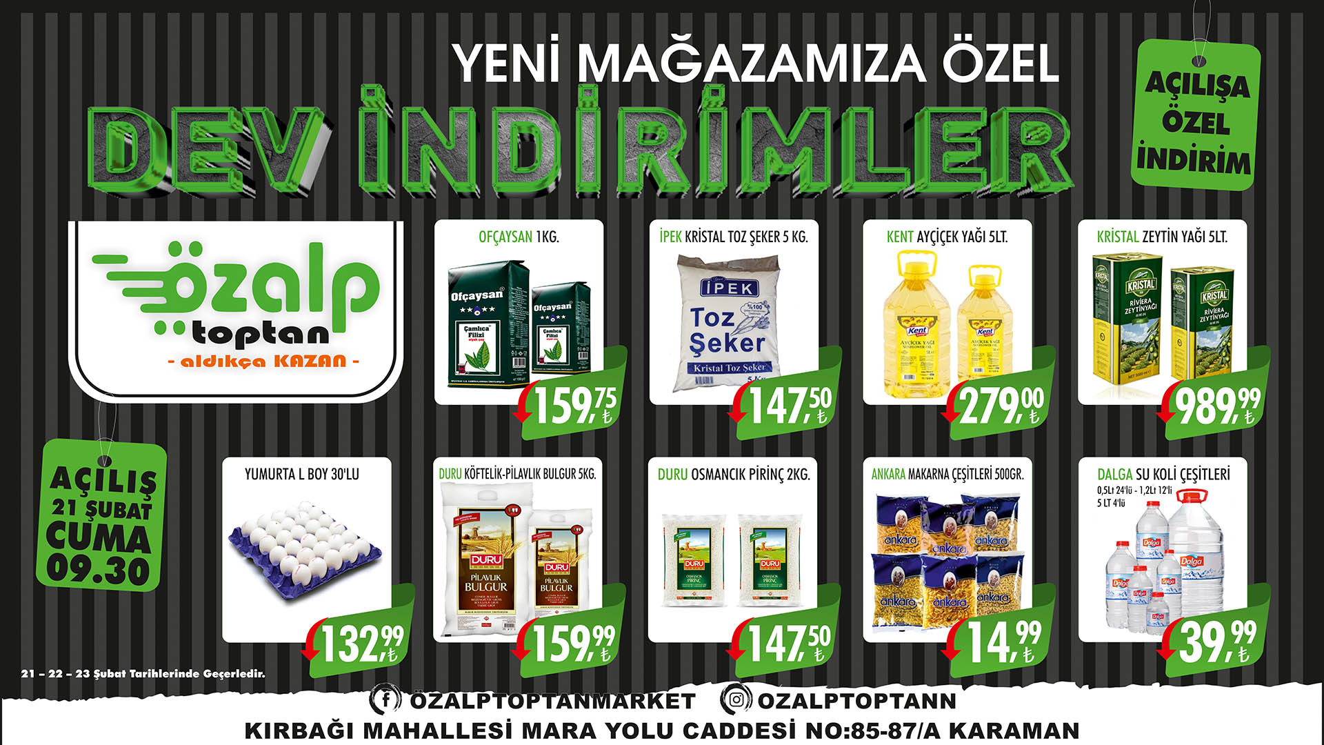 Karaman’ın köklü toptan market zincirlerinden biri olan ve 1987 yılında kurulan Özalp Toptan, yeni şubesinin açılışına özel öyle indirimler yaptı ki görenler gözlerine inanamadı. Çaydan şekere, yağdan, peynire bir eve ne lazımsa o ürünlerde dev indirim yaptı. Özalp Toptan 21 Şubat Cuma günü saat 09.30'da gerçekleştirilecek açılışla birlikte Karamanlıları Türkiye’nin en uygun fiyatlı temel gıda ürünlerini sunacak.
