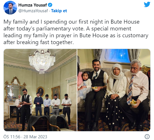 Yusuf, Twitter hesabından yaptığı paylaşımda, "Ailem ve ben bugün (28 Mart) parlamentoda yapılan oylamanın ardından Bute House'daki ilk gecemizi geçiriyoruz. Birlikte iftardan sonra adet olduğu üzere aileme namaz kıldırdığım özel bir an." ifadelerini kullandı.Bir diğer paylaşımında İngiltere Başbakanı Rishi Sunak'la görüştüğünü de aktaran Yusuf, "İskoçya halkının ve parlamentosunun demokratik isteklerine Birleşik Krallık hükümeti tarafından saygı gösterilmesi gerektiğini açıkça ifade ettim." diye yazdı.İskoçya parlamentosunda 28 Mart'ta yapılan oturumda Başbakan seçilen Yusuf ülkenin ilk Müslüman başbakanı olurken, ülkenin en genç milletvekili ve ilk Müslüman bakanı unvanlarının da sahibi.Şubat ayında Başbakan Nicola Sturgeon'un istifasıyla boşalan İskoçya Ulusal Partisi (SNP) liderliğine kullanılan oyların yüzde 52'sine tekabül eden 26 bin 32 oy ile seçilen 37 yaşındaki Yusuf, rakipleri kampanya sürecinde eşcinsel evliliklere ve kürtaj hakkına karşı çıkarken, LGBT haklarını savunacağını beyan etmişti.Pakistan asıllı Yusuf, ayrıca sonuçların açıklanmasının ardından yaptığı açıklamada, İskoçya'ya bağımsızlık getirmeye "kararlı" olduğunu belirtmiş ve "Biz bunu sağlayacak nesil olacağız." demişti.
