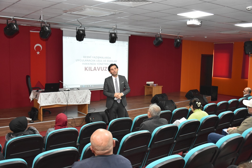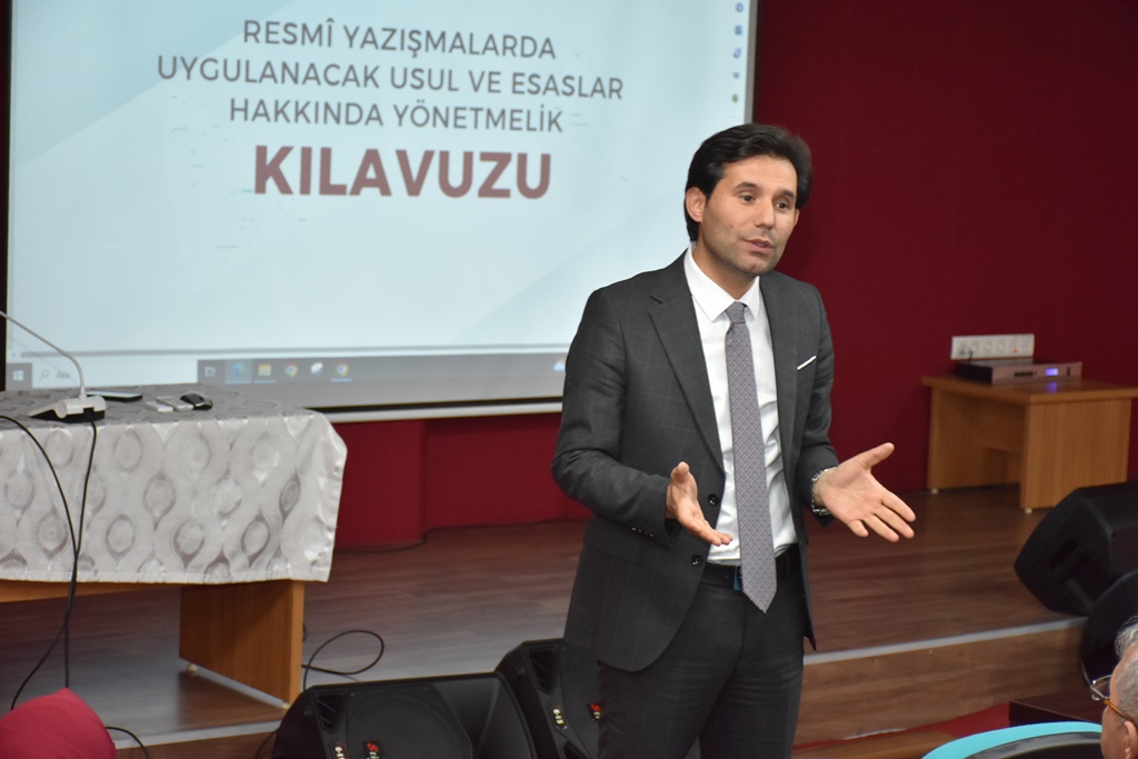 Karaman İl Millî Eğitim Müdürlüğü ve Aile ve Sosyal Hizmetler Müdürlüğünde hizmet veren büro personellerinin resmî yazışmalarda dikkat etmesi gereken kurallar başta olmak üzere resmi yazı çeşitleri gibi konuların ne şekilde yapılması gerektiğine dair eğitim düzenledi.Karaman İl Millî Eğitim Müdür Yardımcısı İsmail Kılınç ve İl Millî Eğitim Müdürlüğü personeli Muharrem Yeni tarafından sunum eşliğinde verilen ‘Resmî Yazışma Kuralları ve Doküman Yönetim Sistemi (DYS)’ konulu eğitime 105 kursiyer katılırken eğitim İl Millî Eğitim Müdürlüğü Konferans Salonu’nda gerçekleştirildi.