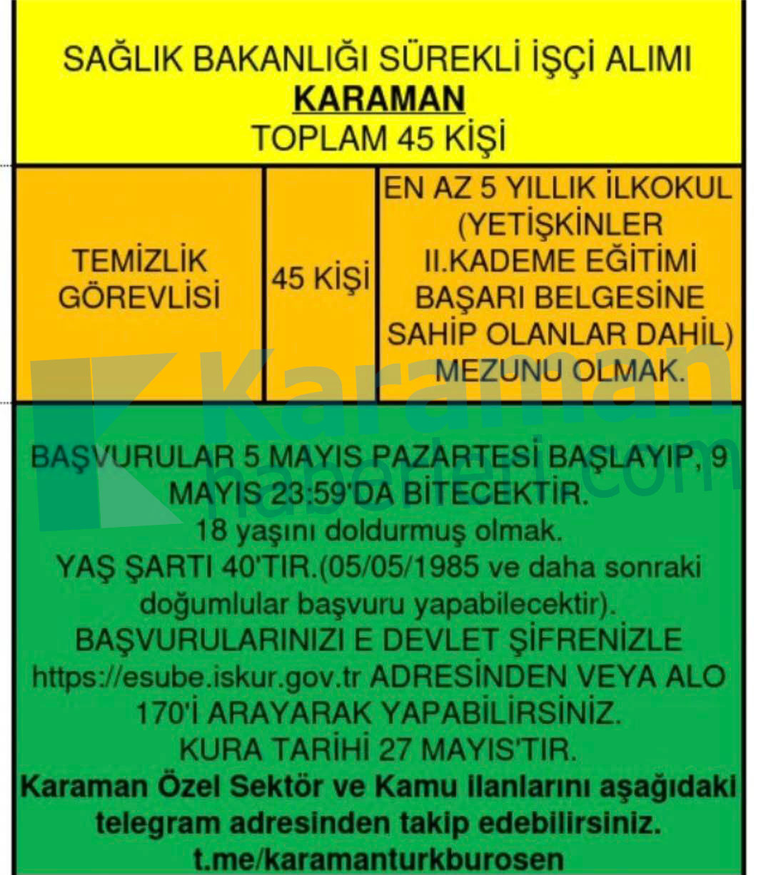 Karamanhaberleri.com muhabirinin edindiği bilgilere göre, Sağlık Bakanlığı'nın sürekli işçi alımı ilanında Karaman için 45 temizlik görevlisi kontenjanı açıldı. En az 5 yıllık ilkokul (Yetişkinler 2. Kademe Eğitimi Başarı Belgesine Sahip Olanlar Dahil) mezunu olan, 18-40 yaş aralığındaki (5 Mayıs 1985 ve sonrası doğumlu olanlar) kişilerin alınacağı işçi alımına, başvurular e-devlet şifresi ile İŞKUR e-şube adresine veya ALO 170 hattını arayarak başvuru yapılabilecek.Başvuruların 5 Mayıs Pazartesi günü başlayıp, 9 Mayıs Cuma günü saat 23:59'da sona ereceği öğrenildi.Karaman için temizlik görevlisi dışında başka alanlara alım yapılıp yapılmayacağı ise 5 Mayıs tarihinden sonra belli olacak.