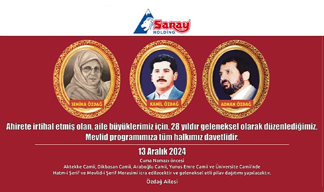 Karaman’ın önde gelen firmalarından Saray Holding, ahirete irtihal etmiş olan aile büyükleri için 28 yıldır geleneksel olarak düzenlediği Mevlid programını bu sene 13 Aralık Cuma gerçekleştirecek.Mevlid programı "Aktekke Camii, Dikbasan Camii, Yunus Emre Camii ve Üniversite Camii" olmak üzere 4 farklı adreste olacak.Mevlid programı aşağıda belirtilen adreslerden sonra Hatm-i Şerif ve Mevlid-i Şerif Merasimi ile devam edecek. Ardından yemek dağıtımı yapılacak.Saray Holding tarafından yapılan açıklamada şu ifadeler yer aldı;“Ahirete irtihal etmiş olan, aile büyüklerimiz için 28 yıldır geleneksel olarak düzenlediğimiz Mevlid progaramımıza tüm halkımız davetlidir.”Tarih: 13 Aralık CumaYer: Aktekke Camii, Dikbasan Camii, Yunus Emre Camii ve Üniversite Camii