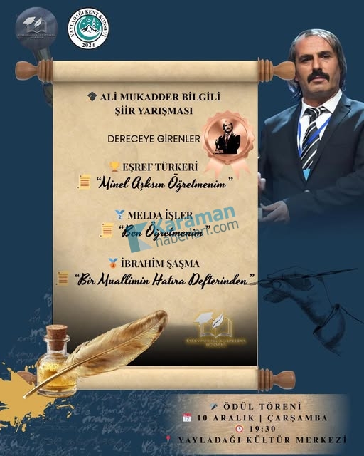 Yarışmanın değerlendirme kurulunda; Niğde Ömer Halisdemir Üniversitesi Türk Dili ve Edebiyatı Bölümünden Prof. Dr. Nedim Bakırcı, Hatay Mustafa Kemal Üniversitesi Türk Dili ve Edebiyatı Bölümünden Doç. Dr. Hüseyin Kürşat Türkan ile alanında uzman şairler yer aldı. Jürinin titiz değerlendirmesi sonucunda üçüncülük ödülü Karaman’a geldi.Şair İbrahim Şaşma, elde ettiği başarıyla ilgili yaptığı açıklamada şunları söyledi: "Kalemin izini sürdüğüm her satırda bir öğretmenin sesi vardı… Onun hatırasına yazılmış bir şiirle, Hatay Yayladağı Belediyesi’nin katkılarıyla düzenlenen ve merhum öğretmen/yazar Ali Mukadder Bilgili adına gerçekleştirilen şiir yarışmasında üçüncülük ödülüne layık görülmek benim için tarifsiz bir gurur. ‘Bir Muallimin Hatıra Defterinden’ adlı şiirim, öğretmenlik ruhuna küçük bir selam, geleceğe bırakılmış mütevazı bir nottur. Destek olan herkese teşekkür ediyor, Rabbime olan şükrümü hep taze tutuyorum. Yazmak güzel şey ve şaşmadan yola devam."Şair Şaşma, ödülünü 10 Aralık’ta Yayladağı’nda düzenlenecek törende alacak.