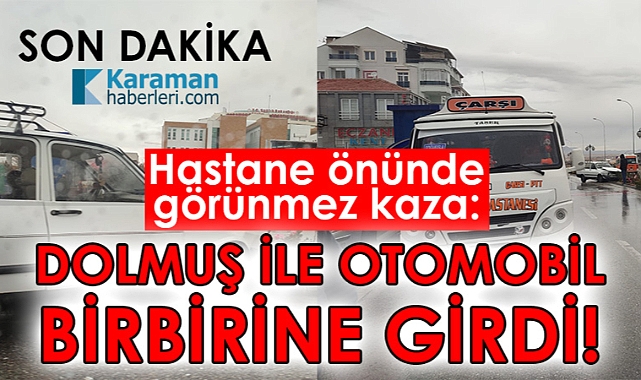 Hastane önünde görünmez kaza: DOLMUŞ İLE OTOMOBİL BİRBİRİNE GİRDİ!Karaman'da yağışların biranda gelmesi kazaları da beraberinde getirdi. Karaman'da bir otomobil, kaygan zeminden dolayı kaza dolmuşla çapıştı.Olay Karaman Eğitim Araştırma Hastanesi önünde oldu. Edinilen bilgilere göre, 33 N 9945 plakalı seyir halinde olan otomobil ile 70 M 0049 plakalı dolmuşa çarpıp refüje girdi.Kazada ölü ve yaralı olmazken araçlarda maddi hasar meydana geldi.Araç sürücülerinin bu yağışlı havalarda dikkatli olması yönünde uyarılar geliyor.