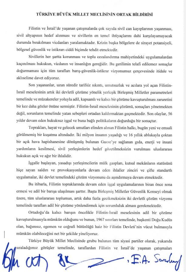 Türkiye Büyük Millet Meclisi (TBMM) Genel Kurulu'nda, Meclis'te grubu bulunan tüm siyasi partilerin imzasıyla Filistin ve İsrail'de yaşanan çatışmalara ilişkin ortak bildiri yayımlandı.