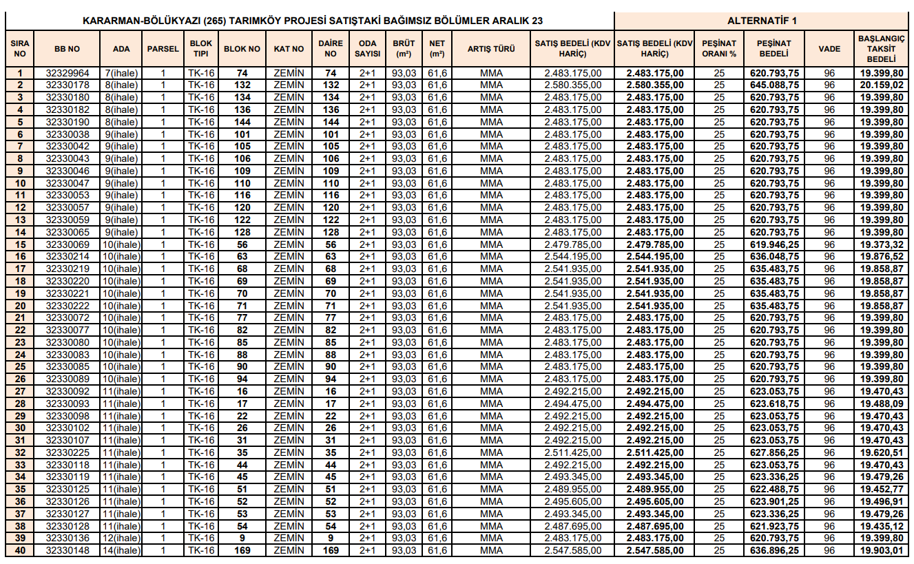 Toplu Konut İdaresi (TOKİ) ve Karaman Valiliği ile işbirliğinde i ile gerçekleştirilen Karaman-Bölükyazı Tarımköy Projesi kapsamında İdaremiz stoklarında bulunan TK-16 (2+1) Tipi toplam 40 adet konut 22 Kasım 01-Aralık 2023 tarihleri arasında T.C. Ziraat Bankası A.Ş. Karaman-Piri Reis Şubesinde, başvuru toplanmak üzere kuralı satışa sunulacak.Söz konusu projeye aşağıda yer alan öncelik sırasına göre;1. Bölükyazı Köyü nüfusuna kayıtlı, köyde evi olmayanlar,
