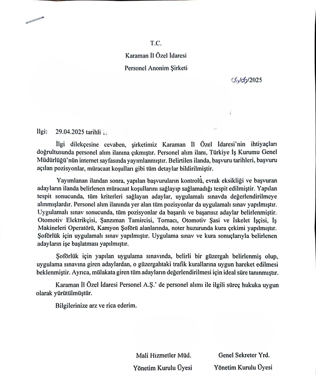 "Avukat Hüseyin Mutlu Şunları Söyledi;ALKIŞLAR EDEBİYAT YAPANLARA DEĞİL, YEREL BASINIMIZA...Göstermelik edebiyat yapanların aklı yeni başına geldi; ancak İKİ HAFTA ÖNCE mazlumun ve mağdurun yanında yer alarak yasal süreci başlatmıştık.Dün itibariyle yerel basınımızda çokça konu olan Karaman İl Özel idaresi işçi alımına ilişkin olarak 29.04.2025 tarihinde tarafımıza bizzat gelen, mülakata girip başvuran işçilerimiz adına hukuki süreci İKİ HAFTA ÖNCE başlatmış bulunmaktayız. Biz sadece bugün değil, bir gün de değil; her gün ve her zaman işçinin yanında olmaya devam edeceğiz. Eğer sakal yanlış yapmışsa kesilmesi bilinmelidir. Zira daha gür çıkacaktır. Ekte ilgili kurumun vermiş olduğu ilk cevap bulunmaktadır.Bu kapsamda BİR ALINTI YAPMAK İSTİYORUM 09.01.2023 ve 09.01.2024 tarihli Karaman İl Genel Meclisi Başkanlığı'nın Gazeteciler günü hasebiyle yapmış olduğu paylaşımlarında da belirttiği gibi; Milletimizin ortak sesi olmanın ötesinde, kamuoyunun vicdanını temsil eden ilkeli ve dürüst yayıncılık prensiplerinden ödün vermeyen, yaşadıkları tüm zorluklara rağmen her koşulda kamuoyunu aydınlatmak için büyük bir özveriyle çalışan yerel basınımızın güzide temsilcileri mesajını aynen kopyalayarak KARAMAN İÇİN MÜCADELE EDEN YEREL BASINIMIZI TEBRİK EDERİM. Üstüne düşen herkes ders çıkartmalıdır. Ancak edebiyat yapanlara da bir çift sözüm var; İl Genel Meclisi 1. başkan vekili ve 3 encümenin 2'si olmasına rağmen yerel basın haber yapıncaya kadar devekuşu rolüne soyunup şimdi göstermelik edebiyat yapmak yakışmıyor.Tarafımıza gelen yüzlerce mesaja ve sosyal medyada bazı yorumlarda ki feryatlara dair KAMUOYU VİCDANI için açıklama zorunluluğu hasıl olmuştur."