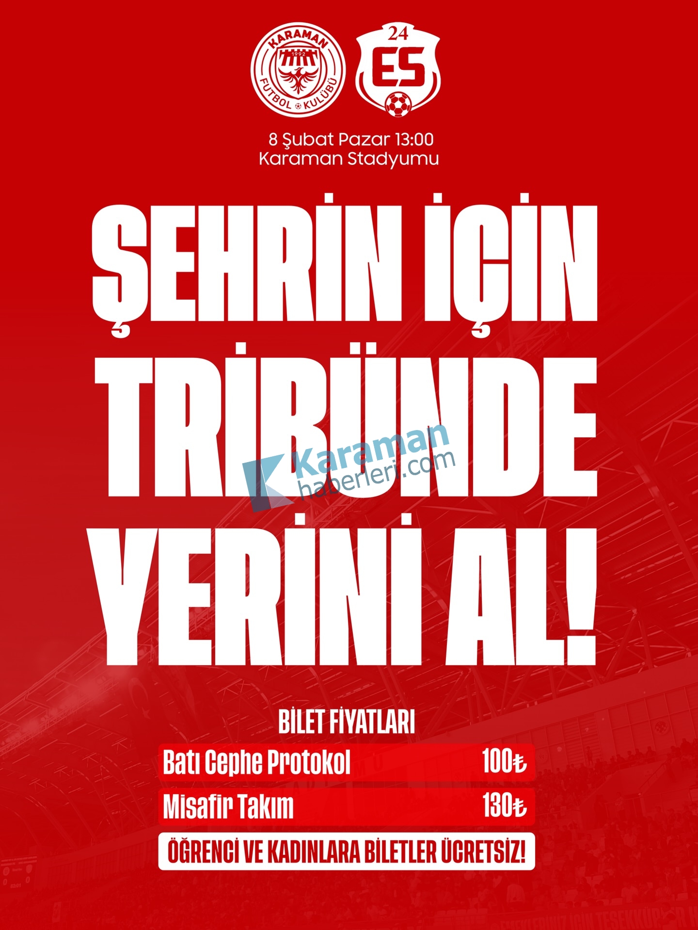 Saat 13.00’te başlayacak mücadele öncesinde kulüp yönetimi, taraftar desteğinin takım için büyük önem taşıdığına dikkat çekti. Yapılan açıklamada, Karaman FK’nın bu önemli karşılaşmada tribün gücünü arkasına alarak sahaya çıkmayı hedeflediği vurgulandı. Kulüp, kadınları ve öğrencileri tribünlere davet ederek hem sosyal farkındalık oluşturmayı hem de tribün atmosferini güçlendirmeyi amaçlıyor.