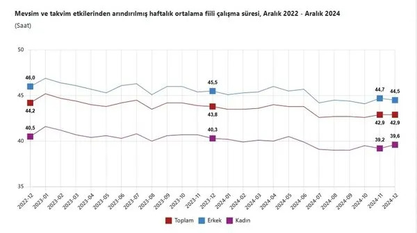 İstihdam edilenlerin toplam sayısı, Aralık ayında 54 bin kişi azalarak 32 milyon 718 bin kişi olarak kaydedildi. Buna bağlı olarak istihdam oranı, 0,1 puanlık düşüşle %49,5 olarak gerçekleşti.Cinsiyete göre istihdam oranları ise şöyle oldu:- Erkeklerde %66,9,