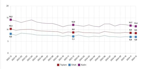 İşsizlik Oranı %8,5’e GerilediAralık ayı itibarıyla, 15 yaş ve üzeri bireyler arasında işsiz sayısı bir önceki aya kıyasla 39 bin kişi azalarak 3 milyon 26 bine düştü. Böylece işsizlik oranı, 0,1 puanlık bir gerilemeyle %8,5 seviyesinde gerçekleşti.Cinsiyete göre değerlendirildiğinde: