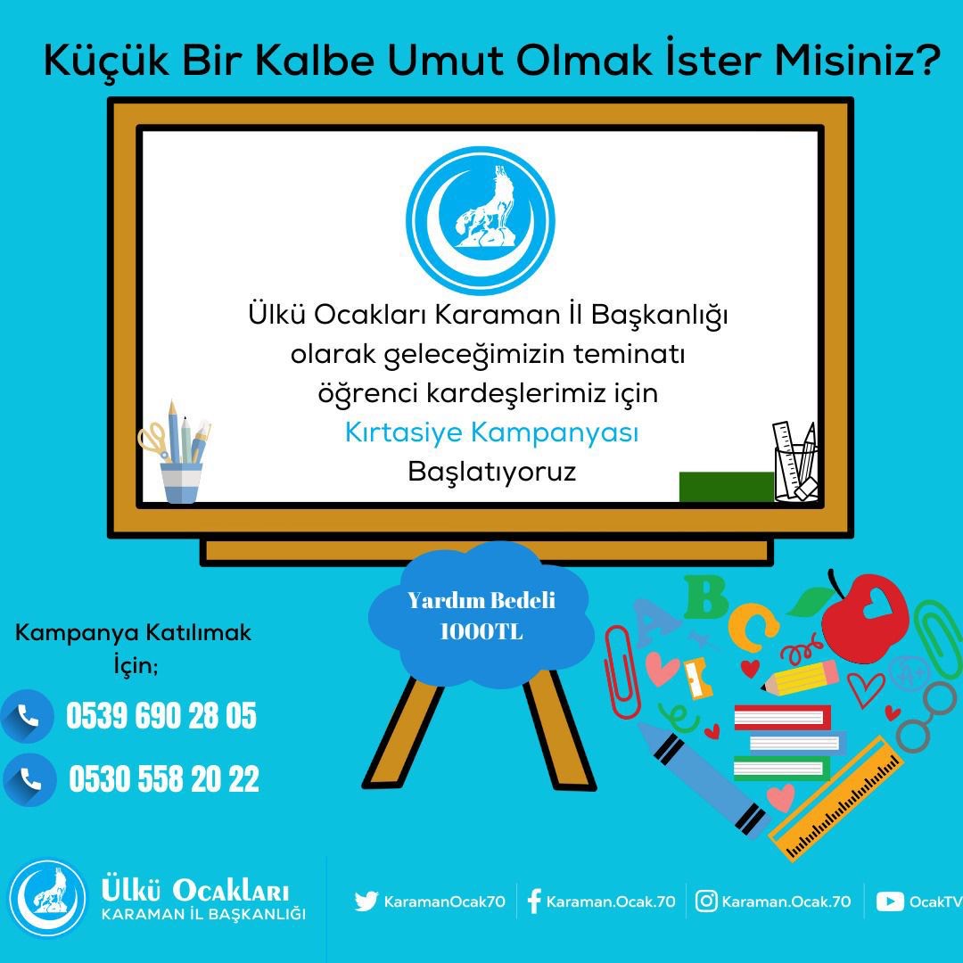 Eğitim, bilgiyle büyüyen bir çiçek gibidir; kırtasiye yardımı, bu çiçeğin gelişimini destekleyen su ve ışık gibidir. Geleceğimiz için küçük bir destek büyük bir fark yaratır. Her yıl olduğu gibi bu sene de Ülkü Ocakları Karaman İl Başkanlığı Olarak İhtiyaç Sahibi Öğrencilerimizin Yanında Olacağız.