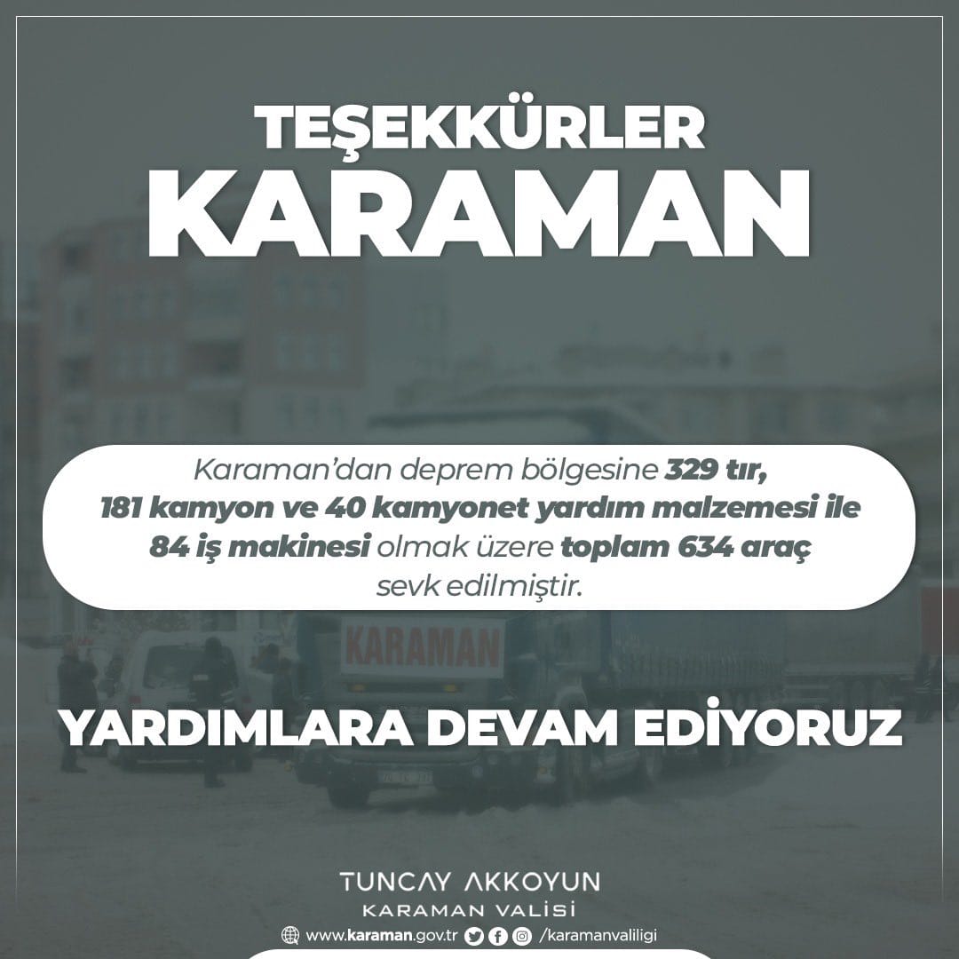 Kahramanmaraş’ın Türkoğlu ilçesinde Koordinatör Vali görevini yürüten Karaman Valisi Sayın Tuncay Akkoyun yapılan yardımlardan ötürü Karaman halkına teşekkür etti. İlk günden bu yana deprem bölgesine yardımlarını sürdüren Karaman her türlü desteği de vermeye devam ediyor.Karaman'dan deprem bölgesine 329 tır, 181 kamyonet yardım malzemesi ile 84 iş makinesi olmak üzere toplam 634 araç destek için gönderildi. Afetin ilk anından itibaren gayret ve fedakarlıkla depremzede vatandaşlara destek olmak için çaba gösteren ve deprem bölgesine desteğin sürdüğünü belirten Vali Akkoyun Karaman halkına teşekkürlerini iletii.Vali Akkoyun, ""El ele, gönül gönüle vererek hep birlikte afet bölgesine destek oluyoruz." diyen Akkoyun "Afetin ilk anından itibaren gayret ve fedakârlıkla afetzede vatandaşlarımızın yaralarını sarmak için çaba gösteren gönlü güzel Karamanlı hemşehrilerimize teşekkür ediyorum. Kalıcı konutlar inşa edilene kadar yardımlarımıza aralıksız devam etmeliyiz. Desteğe devam ediyoruz." ifadelerini kullandı.