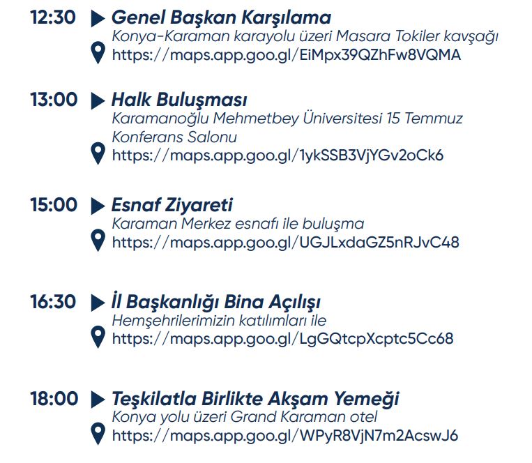 Konferans salonundaki programın ardından saha çalışmalarına ağırlık verilecek. Programın akışı şu şekilde devam edecek:- 15:00 – Esnaf Ziyareti: Ağıralioğlu, Karaman Merkez’de çarşı esnafını ziyaret ederek vatandaşların sorunlarını ve taleplerini yerinde dinleyecek.