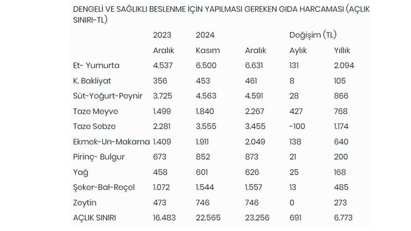 Açlık Sınırı 23 Bin 256 TL’ye ÇıktıBirleşik Kamu-İş Konfederasyonu Ar-Ge birimi KAMU-AR tarafından hazırlanan rapor, aralık ayı itibarıyla açlık sınırının 23 bin 256 TL, yoksulluk sınırının ise 71 bin 48 TL olduğunu ortaya koydu. Bu veriler, yeni asgari ücretin daha yürürlüğe girmeden açlık sınırının 1.152 TL gerisinde kaldığını gözler önüne serdi.KAMU-AR Raporu: “Asgari Ücret Açlık Sınırını Karşılamıyor”Raporda, yeni asgari ücretin yetersizliği net bir şekilde vurgulandı:“Ocak 2025 itibarıyla uygulanmaya başlanacak olan 22 bin 104 TL’lik yeni asgari ücret, daha uygulanmadan açlık sınırının altında kalmıştır. Bu durum, çalışanların temel ihtiyaçlarını bile karşılamalarını imkânsız hale getirmektedir."Açlık sınırı, bu yıl sonuna kadar 17 bin lira olarak uygulanan asgari ücretin 6 bin 46 lira üzerine çıktı. Ocak ayından itibaren uygulanmaya başlanacak olan 22 bin 104 liralık yeni asgari ücret ise daha uygulanmadan açlık sınırının 1152 lira altında kaldı.Diğer bir ifadeyle asgari ücret dört kişilik bir ailenin sadece 28 günlük beslenme harcamalarına yetecek. Yeni asgari ücret yoksulluk sınırının ise üçte birini bile karşılamıyor. Buna göre ailede iki kişinin asgari ücretle çalışarak kazanacağı ücret bile yoksulluk sınırına ulaşmıyor.2024 yıl sonu enflasyonu TÜİK’e göre bile yüzde 46-47 seviyesinde gerçekleşecek. Yapılan yüzde 30 oranındaki zam 2025 yılı asgari ücretinin, daha başlangıçta 2024 yılı asgari ücretinin reel olarak yüzde 11-12 oranında altında kalmasına yol açacak. Bu reel gerileme enflasyonla mücadelenin tüm faturasının ücretlilere yüklenmek istendiğini ve ücretlileri zor bir yılın beklediğini de gösteriyor.Ankara’da en fazla alışveriş yapılan marketlerden derlenen fiyatlara göre, dengeli beslenebilmek için et- balık- yumurta için aylık olarak yapılması gereken harcanmanın tutarı aralıkta bir önceki aya göre 131 lira, yıllık olarak ise 2 bin 94 lira artarak 6 bin 631 lira oldu.Kuru bakliyat için yapılması gereken harcama önceki aya göre 8 lira, geçen yıla göre ise 105 liralık artışla 461 lira oldu.Bir önceki aya göre 28 lira artarak 4 bin 591 liraya yükselen süt, yoğurt ve peynir için yapılması gereken harcama son bir yılda ise 866 lira arttı. Meyve için harcanması gereken para önceki aya göre 427 lira arttı, geçen yılın aynı ayına göre ise 768 lira artarak 2 bin 267 lira oldu. Sebze için harcaması gereken tutar ise önceki aya göre 100 lira azaldı, geçen yılın aynı ayına göre ise bin 174 lira artarak 3 bin 455 lira olarak hesaplandı.Ekmek, un ve makarna gibi ürünler için yapılması gereken harcama aralıkta 138 lira artarak 2 bin 49 liraya, pirinç ve bulgur harcamaları 21 lira artarak 873 liraya çıktı. Yağ için yapılması gereken harcama ise 25 liralık artışla 626 liraya yükseldi. Şeker, bal, pekmez, reçel harcaması önceki aya göre 13 lira artarak bin 557 lira oldu. Aynı ailenin zeytin için yapması gereken harcama ise 746 lirada kaldı.