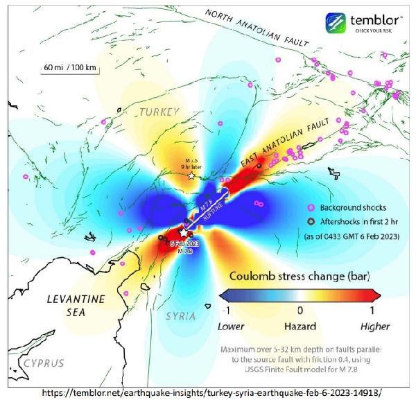 Doç. Dr. Özacar, yaşanan depremlerin diğer fayları etkileyip etkilemeyeceği konusunda da çalışmaları olduğunu belirterek, "Bu, statik stres seviyelerinin, yani deprem olduktan sonra da komşu faylardaki stres seviyelerinin arttığını, artabileceğini gösteriyor. Temblor kaynaklı haritada da statik stresin özellikle sıcak renklerde yani kırmızı ve koyu turuncu renklerde arttığı bölgeleri gösteriyor. Bu modelde 2'nci depremin bulunduğu Savrun- Sürgü fayının olduğu kısımda statik stresin seviyesi artıyor. Bunun ayrıca dinamik olarak, yani sistemi salladığınız zaman (yer sarsıntısı) diğer faylarda da bir sürtünme azalımı olduğu da belirlenmiş durumda. Bu anlamda baktığımız zaman hem tetiklenen fayda, yani Savrun- Sürgü hattında hem de güneyde 14'üncü yüzyılda en son kırılmış 1408 yılında kırılmış olan Ölüdeniz Fayı'nda (Hatay'ın güneyi) potansiyel olarak bir stres artışına neden olması kuvvetle muhtemel. Bir önemli diğer hattımız ise Doğu Anadolu Fay hattı üzerinde bulunan Malatya fay hattı. Yukarı doğru giden Malatya hattında da stres biriktirip biriktirmediği incelenecek. Halkımız bu anlamda dikkatli olması lazım. Tetiklenme sonucu büyük bir deprem olmasa bile genelde yaklaşık kural ana depremin 1 logaritmik magnitude aşağısında artçı olabileceğidir. Bu da 7.7 büyüklüğündeki bir depremin artçılarının bile 6.8 ya da 7 büyüklüğünde olabileceği için kesinlikle hasarlı binalarda bulunmamalılar. Gerekli, onlara ayrılan yerlerde kalmalarını özellikle tavsiye ediyoruz" ifadelerini kullandı.