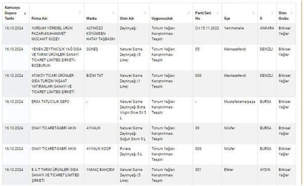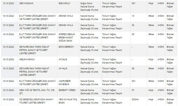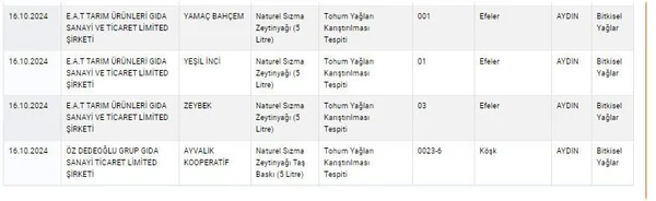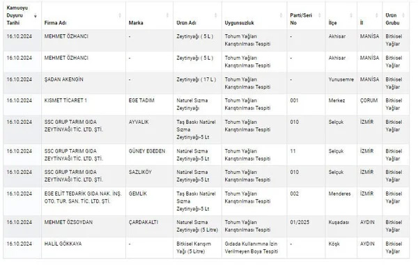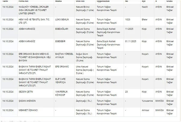 Tarım ve Orman Bakanlığı, halk sağlığını tehlikeye atan ve hileli üretim yapan firmaları ifşa etmeye devam ediyor. Bakanlık, 16 Ekim'de güncellendiği listede birçok sahte gıda karını açıkladı. Özellikle zeytinyağı sektöründeki etiketler dikkat çekti.