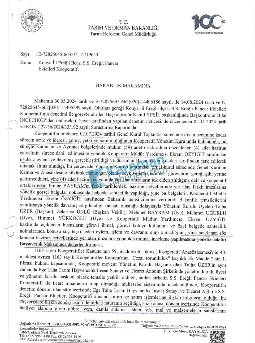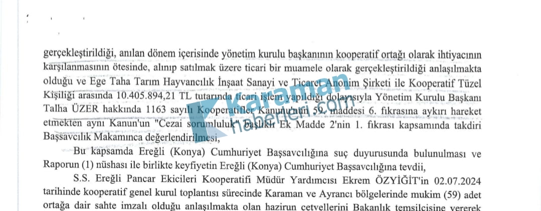 Yunus Çelik: "Seçimsiz Mali Genel Kurul'da bile hile yapıldığına dair raporlar varken, Biz size nasıl güvenelim?"Ereğli Pancar Ekicileri Kooperatifi Başkan Adayı Yunus Çelik, 2024 yılında yapılan Mali Genel Kurul'da sahte imzalı işlem yapıldığına dair Bakanlık müfettişlerince hazırlanan raporlara atıfta bulunarak, önceki dönemlerde yaşanan usulsüzlüklere ilişkin önemli açıklamalar yaptı.Yunus Çelik, kooperatifte üreticinin güvenini yeniden tesis edeceklerini belirterek, “19 Ekim’de tertemiz bir sayfa açacağız. Her oy gerçek sahibine yazılacak” dedi.Çelik açıklamasında şu ifadelere yer verdi:“Biz bu toprağın bereketine, alın terinin kutsallığına inanan insanlarız.