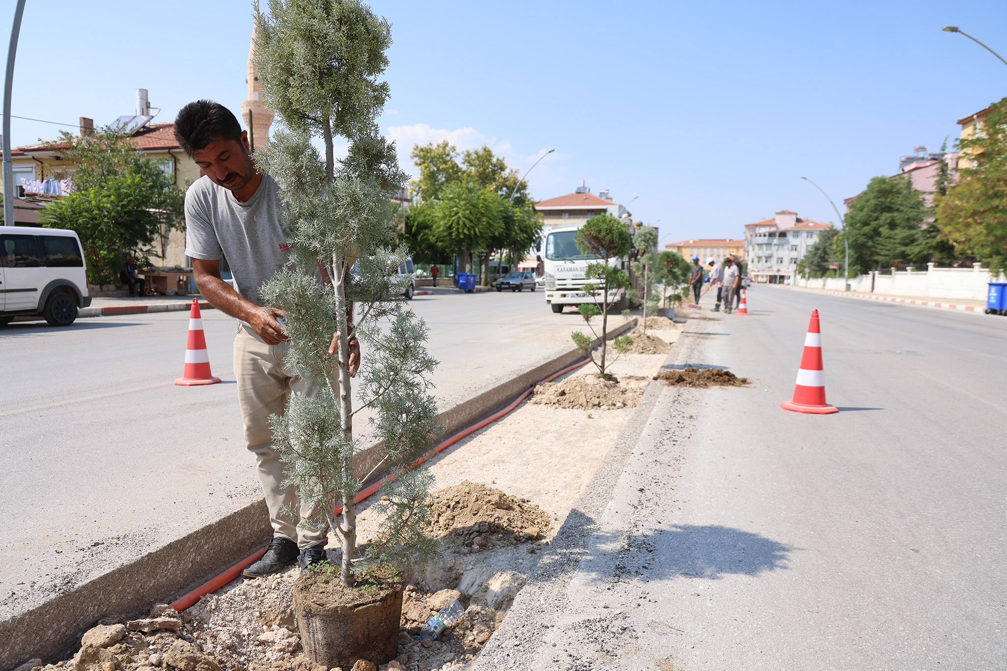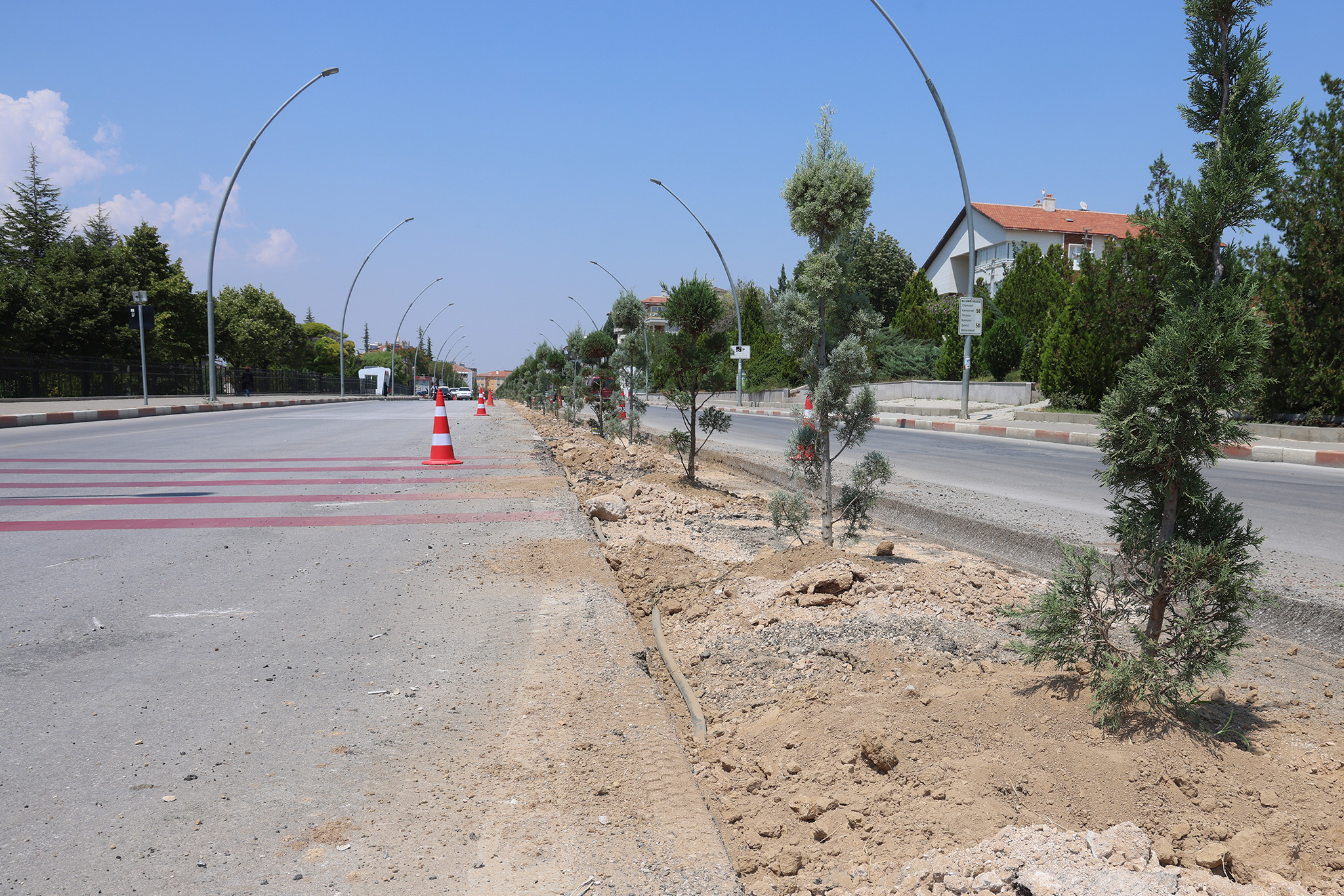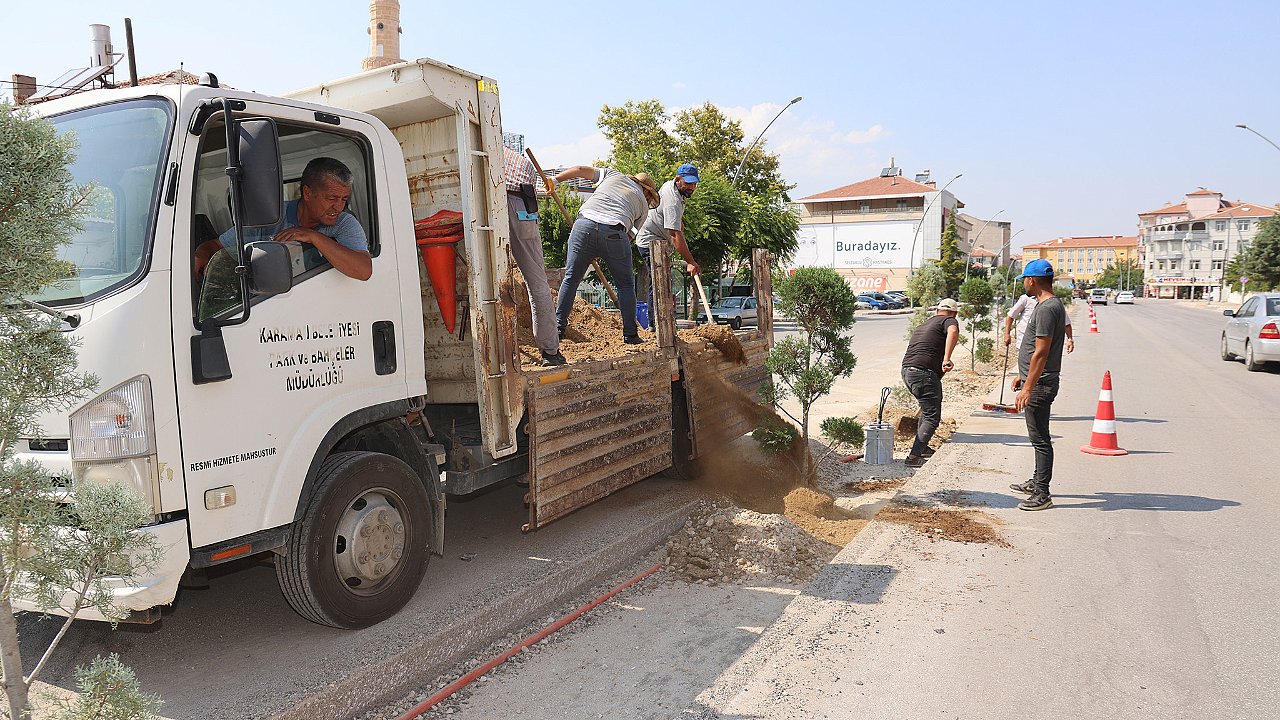 Karaman'da şehir içi ulaşımın önemli güzergâhlarından biri olan Zeytin Dalı Bulvarı'nda, trafik akışını daha konforlu ve güvenli hale getirmek için başlatılan orta refüj çalışması tüm hızıyla devam ederken bir taraftan da bitkilendirme çalışması yapılıyor. Kentin her köşesini birbirinden güzel mevsimlik çiçekler ve bitkilerle süslemeye devam eden belediye ekipleri, bu kez de Zeytin Dalı Bulvarı'nda orta refüj için kazılan alana mavi servi ve leylandi türü ağaçlar dikiyor. Orta refüjde peyzaj düzenlemesi tamamlandıktan sonra çeşitli renklerde güller de bulvarı süsleyecek.